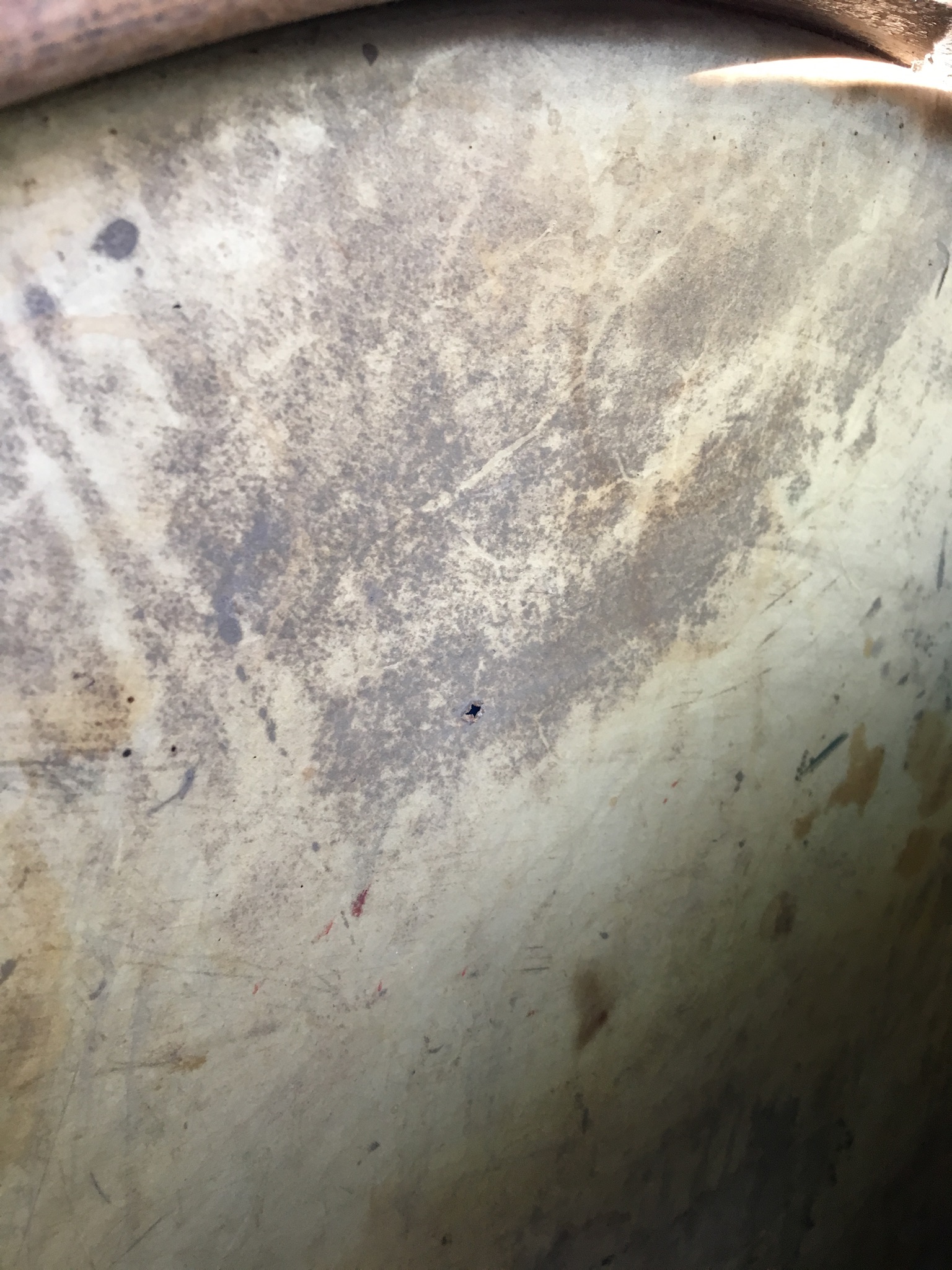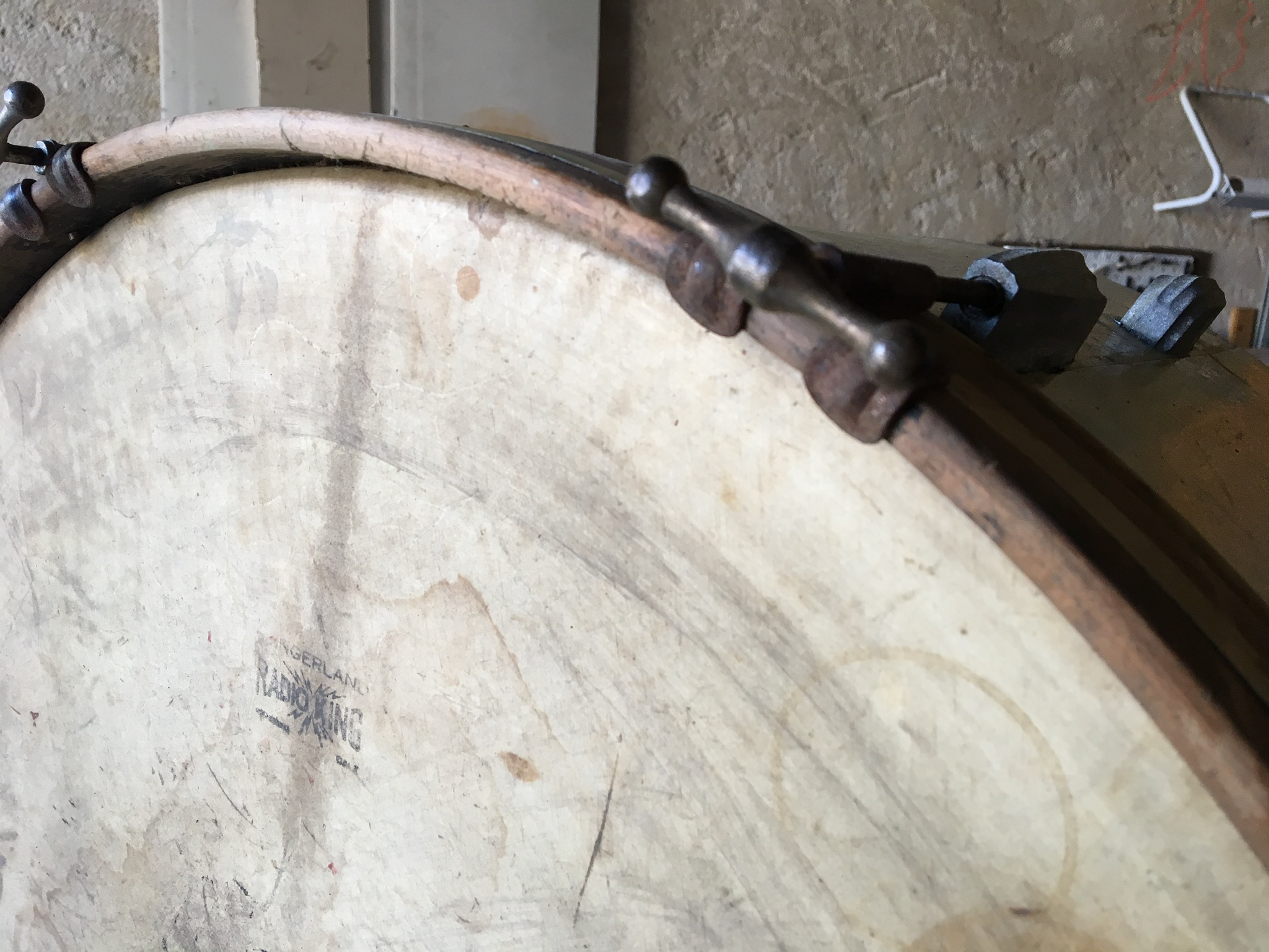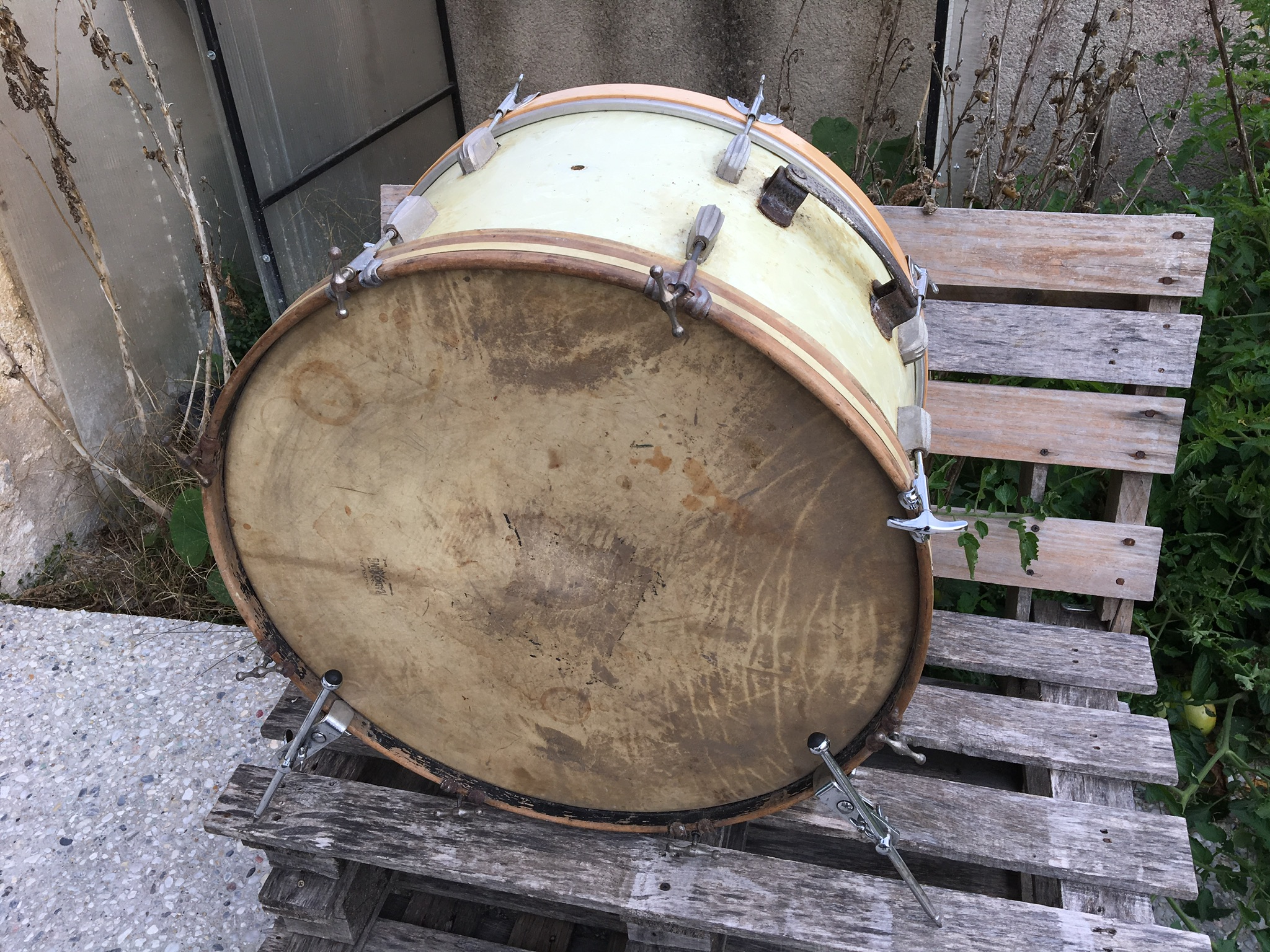 J’ai donc récupéré hier une Slingerland « Radio King « , 24x14 , white Marine Pearl incomplète et crade. Sont présents : 1 cercle dé-peint, une peau de bête, 7 griffes et 5-rods, les 16 coquilles complètes et « la poignée rouillée », à savoir le plat pour supporter le tom. Le badge a fui avec les autres pièces manquantes.