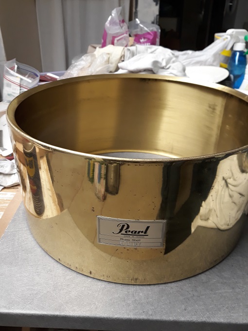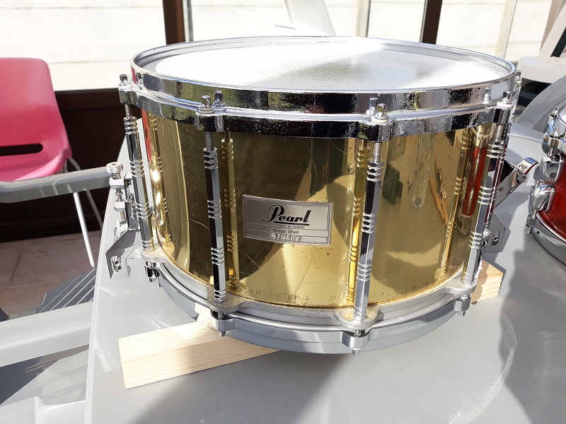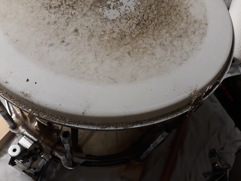 A la différence du reste de la batterie, elle était encore plus de poussière, et même avec un peu de paille coincée entre la peau et les cercles, le chrome du cercle n’a pas aimé le passage des années, il ne pèle pas (ce n’est quand même pas une ludwig