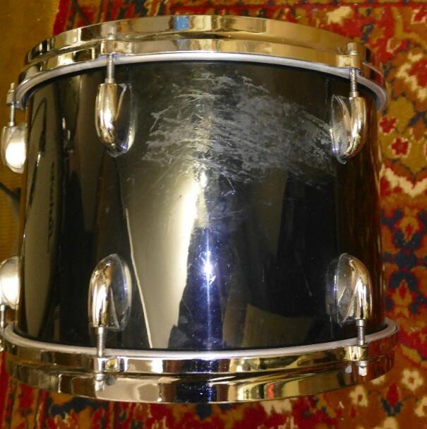 le tom basse a bien le bon diamètre, mais si on lui rajoute l'épaisseur du wrap ça devient beaucoup moins négociable; et encore ce n'est pas un Delmar, avec lequel la peau ne serait pas passée; ça me fait penser aux Hayman, avec lesquelles faut pas rigoler, ou à Vavou et sa Gary fièrement sparkelisée d'un bon gros Delmar d'un demi-doigt d'épaisseur qu'on avait été obligé de recouper au ras du cerceau de montage de la peau.
