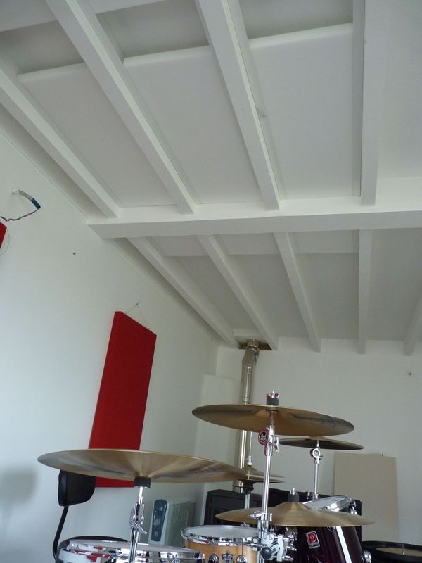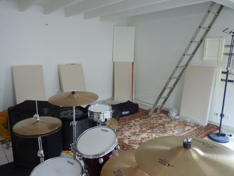 J'ai posé les panneaux en bas, ceux des coins et ceux derrière la batteuse, j'ai mis la basotect au plafond au dessus du kit et je n'ai pas encore fait d'essais sonores à plein volume.