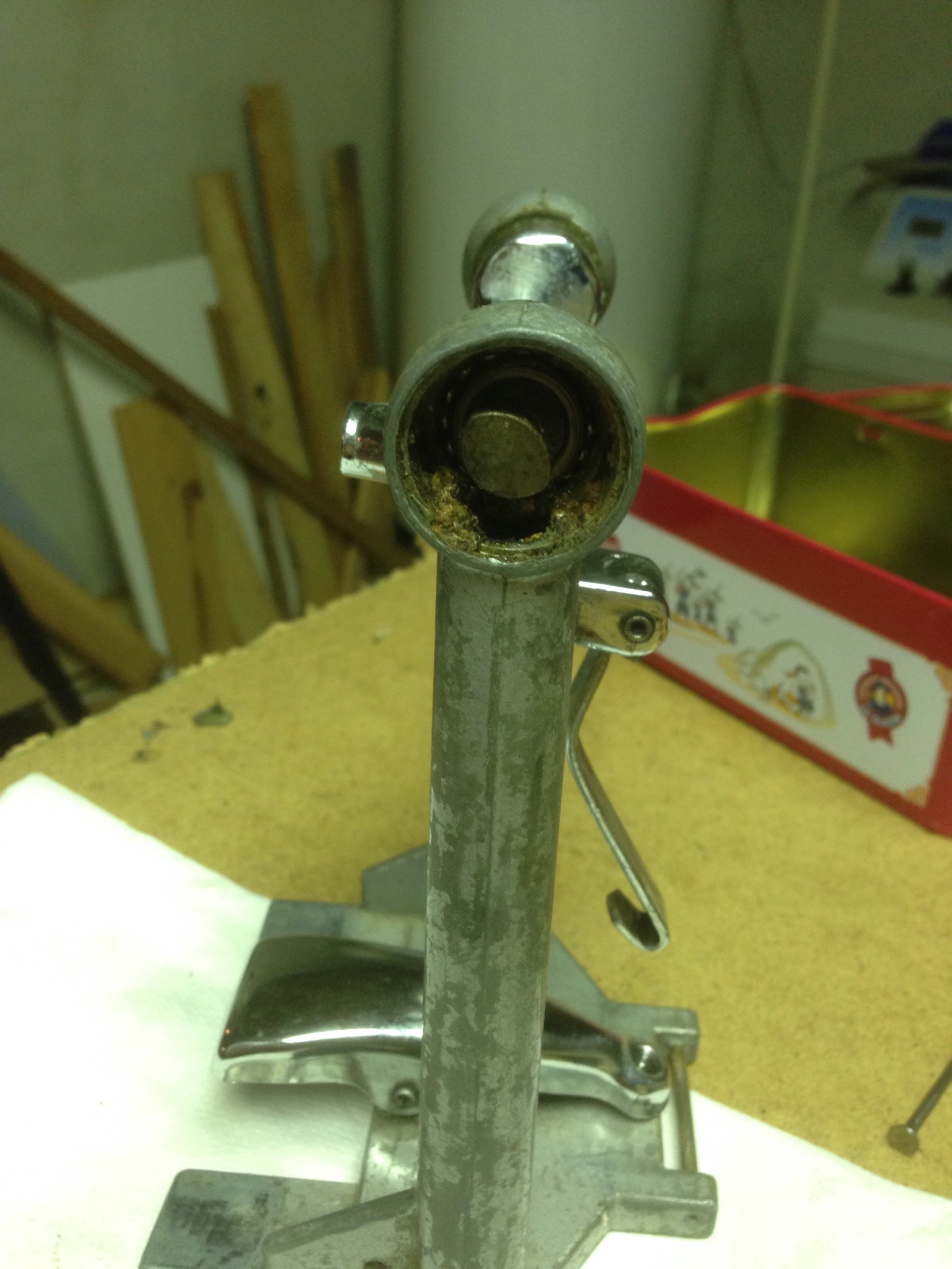 1ère étape - démontage : vous devez la démonter entièrement... je vous passe les détails de la semelle, et de la batte... par contre, le système de came/tension/ressort étant interne, les choses se compliquent... Attention, notez bien le sens de montage des pièces au fur et à mesure (pièce X sur potence 1 ou 2, et le sens dans lequel la pièce est montée... ou une photo) car elles ont un sens de montage ! Commencez, par les opercules siglées Ludwig Chicago de chaque côté des potences : pas la peine de forcer avec un tournevis, vous allez tout massacrer !! la bonne technique consiste à entourer la potence avec un chiffon (en 3 ou 4 épaisseurs), puis à prendre un marteau, et taper sur la potence... Les vibrations/chocs feront "sauter" l'opercule... Attention, ne surtout pas jouer du marteau en ayant posé la potence sur le plan de travail, vous allez tordre la potence... d'une main maintenez dans le vide la potence entourée du chiffon, et de l'autre tapez sur le chiffon avec le marteau... Normalement, l'opercule saute au bout de seulement quelques coups... Même punition pour la 2ème, et vous trouverez ceci :