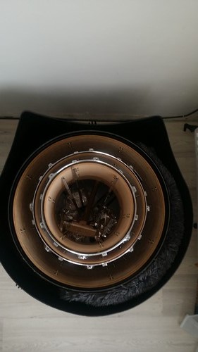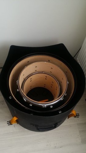 Ensuite je me suis demandé comment stocker les peaux. Après les avoir posées sur le tom 12 elles n'étaient pas stables donc pour éviter de les abîmer. J'ai récupérer une housse de cymbales non utilisée et j'ai tout mis dedans.