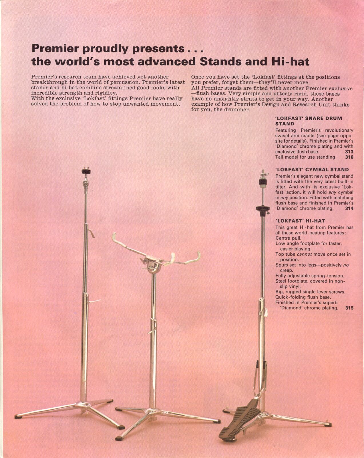 Le pied de caisse claire "Lokfast" est présent dans le catalogue Premier de 68, p. 16-17 :