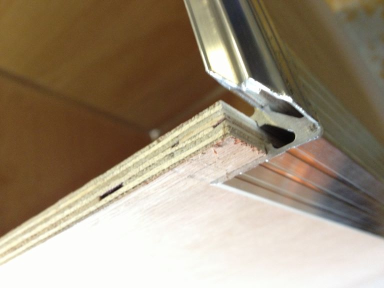 Là je me suis compliqué la tache pour rien.comme je n'avais jamais trop utilisé de rivets dans le bois auparavant je pensais qu'il y aurait un petit jeu à cause de l'épaisseur du profilé de fermeture... En fait non, car les rivets c'est vachement efficace ! Mais bon c'est fait donc je vais les installer mes petites coupes d'onglet qui ont failli me coûter des doigts!