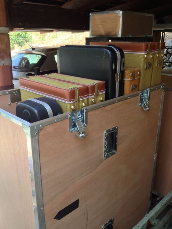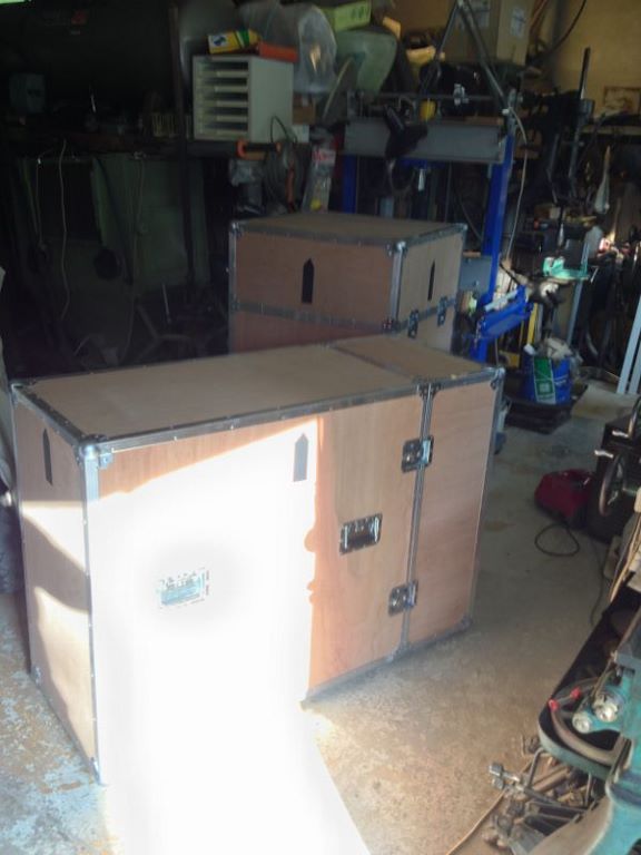 Et voilà où j'en suis, c'est presque fini, il me reste à couvrir l'intérieur de mousse, et installer des charnieres supplémentaires, pour virer les bouts de sangles, là je testais les sangles que j'ai riveté au fond pour maintenir les pieds quand je tippe le flight dans le camion, et ça marche bien, je suis content!