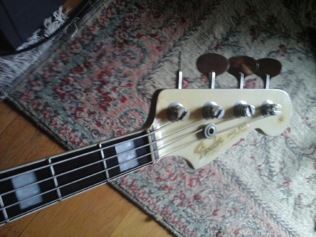 C'est un "custom shop" fait par moi même suivant un cahier des charges très strict : élaborer la réplique exacte d'une Jazz bass 65' (la première année d'apparition des block inlays sur le manche) . Vernis nitro cellulose, mecaniques lollipop, micros bobinés main et ultra fidèles aux originaux Fullerton. La raison en est simple : je n'aime pas trop les Jazz bass "modernes" et une originale me couterait une somme totalement hors de portée de ma bourse. L'objectif est atteint avec une basse légère (frêne des marais) au son charnu et plein de beaux bas medium !
