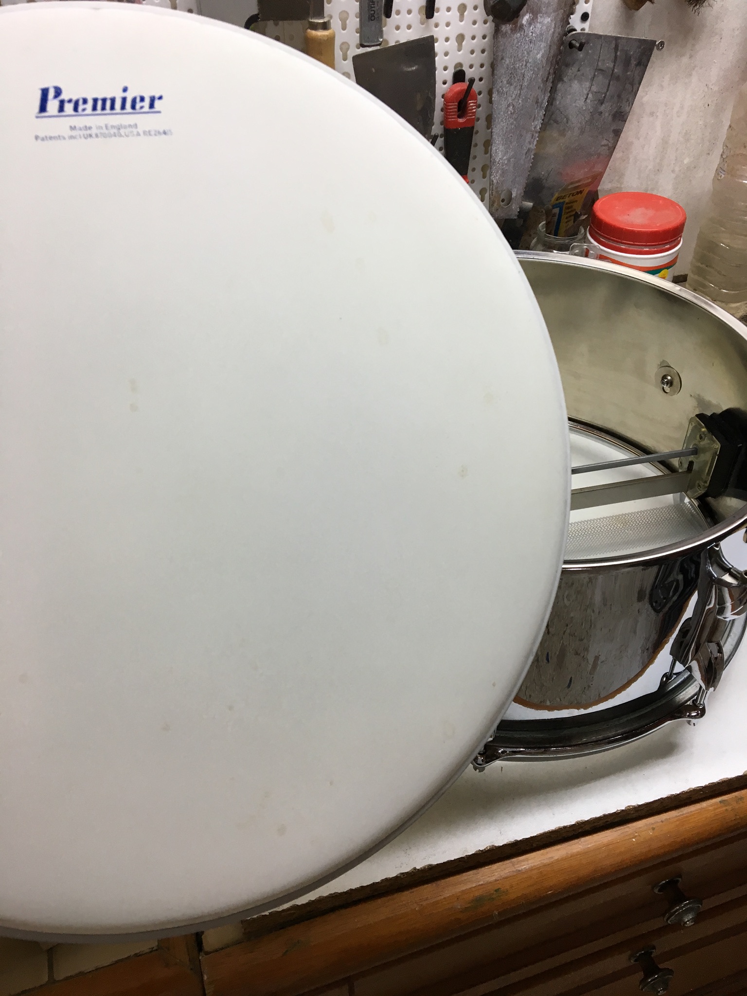 A l’evidence, je peux en chercher une de rechange. Enfin, Fanch m’avait filé une peau de frappe Premier pour aller avec, je l’avais bien lavé et tout. C’etait sans compter sur le cercle moulé à la Premier.