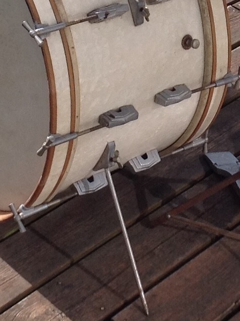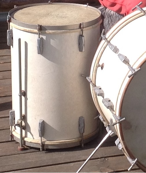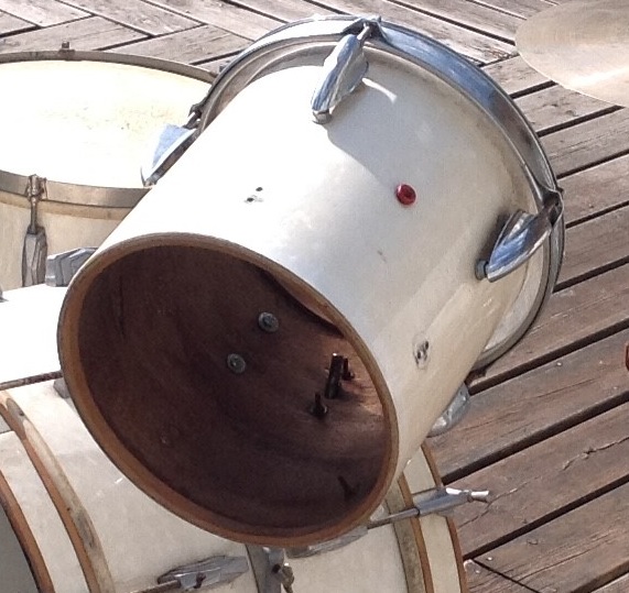 Oui, dommage, effectivement. La peau (chèvre?) avait été percée (autour des années 80). Les magasins de musique visités n'ayant pas les peaux ni les dimensions d'origine, la batterie a donc été équipée avec un set standard.