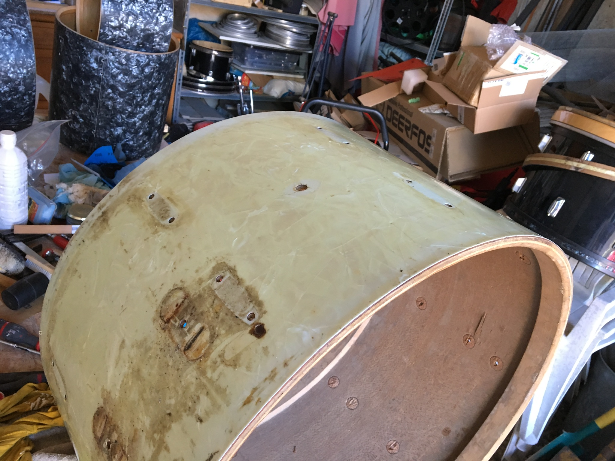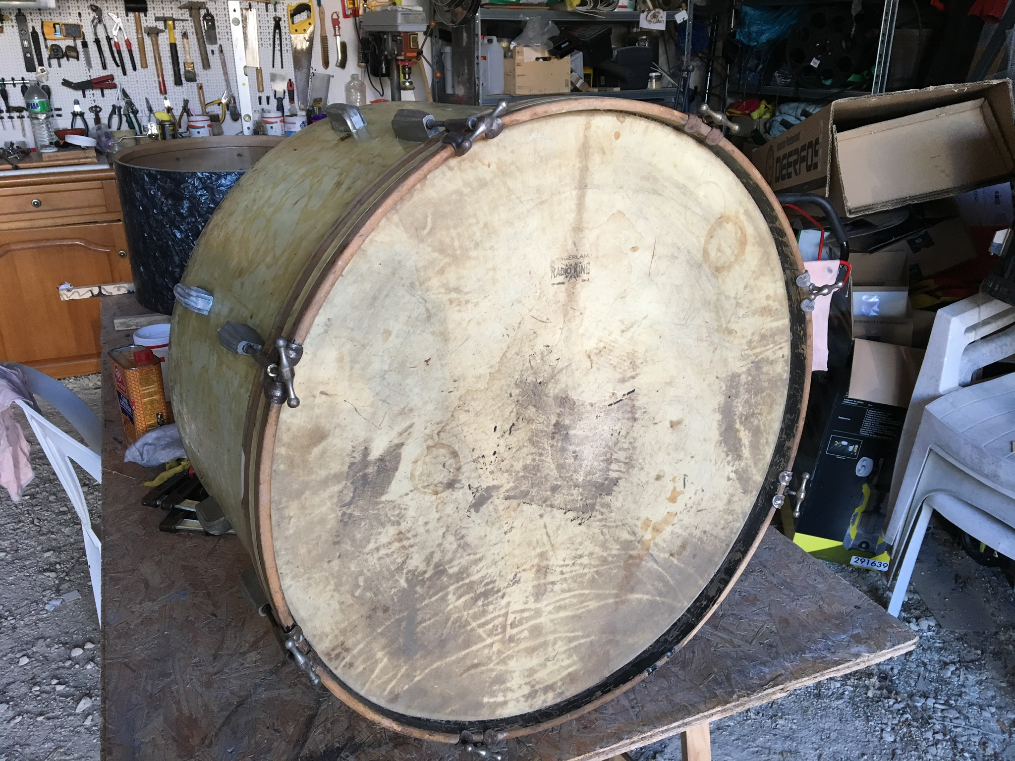 J’ai donc récupéré hier une Slingerland « Radio King « , 24x14 , white Marine Pearl incomplète et crade. Sont présents : 1 cercle dé-peint, une peau de bête, 7 griffes et 5-rods, les 16 coquilles complètes et « la poignée rouillée », à savoir le plat pour supporter le tom. Le badge a fui avec les autres pièces manquantes.