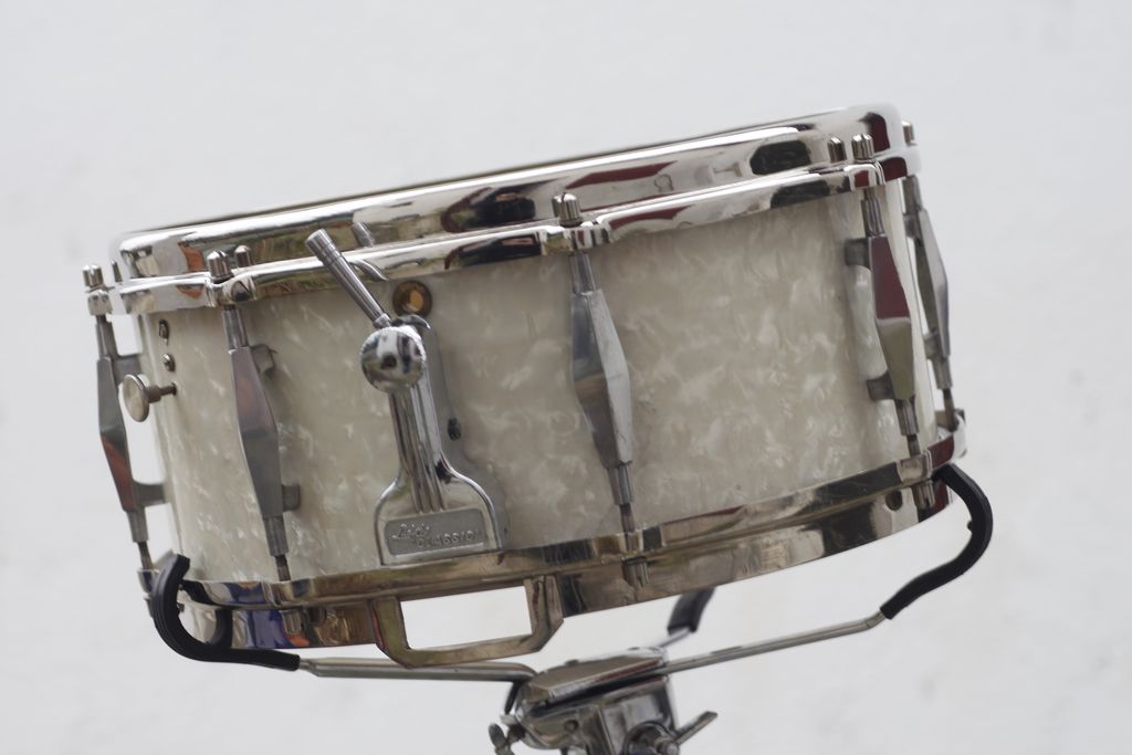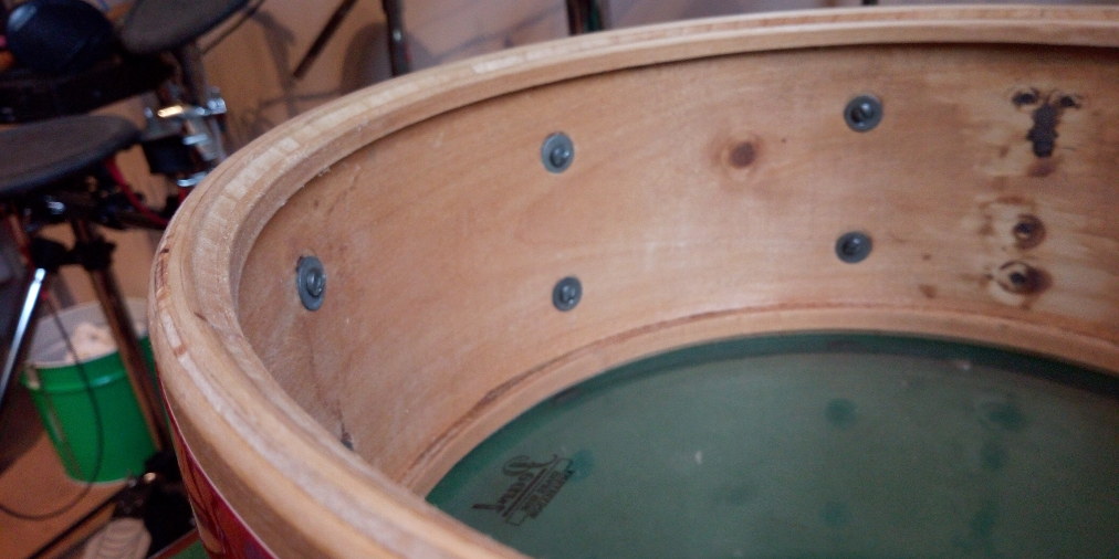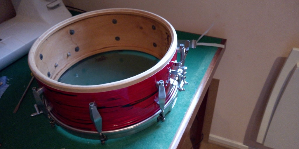 Voilà 25 ans, un ami me donna une caisse claire "réparée", des fois que je pusse m'en occuper. En fait de réparée, elle était massacrée, et pire qu'à la tronçonneuse : chanfreins évoquant les montagnes russes, fût percé de partout pour installer au cours des âges différents déclencheurs, revêtement white pearl jauni et déglingué, trous rebouchés à la truelle... Elle était moche, injouable, inaccordable.