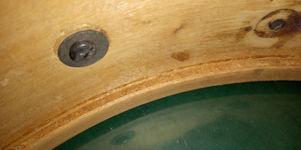Et à faire les snare beds aussi... A ce sujet, je n'avais pas pu prendre exemple sur les éventuels snare beds que cette caisse arborait avant la rectification et le défonçage. Je me demande encore comment on a pu massacrer à ce point les chanfreins. A part démonter les cercles et traîner la caisse derrière une mobylette sur du gravier, je ne vois pas... Bref, je n'ai rien pu mesurer pour reproduire les snare beds.