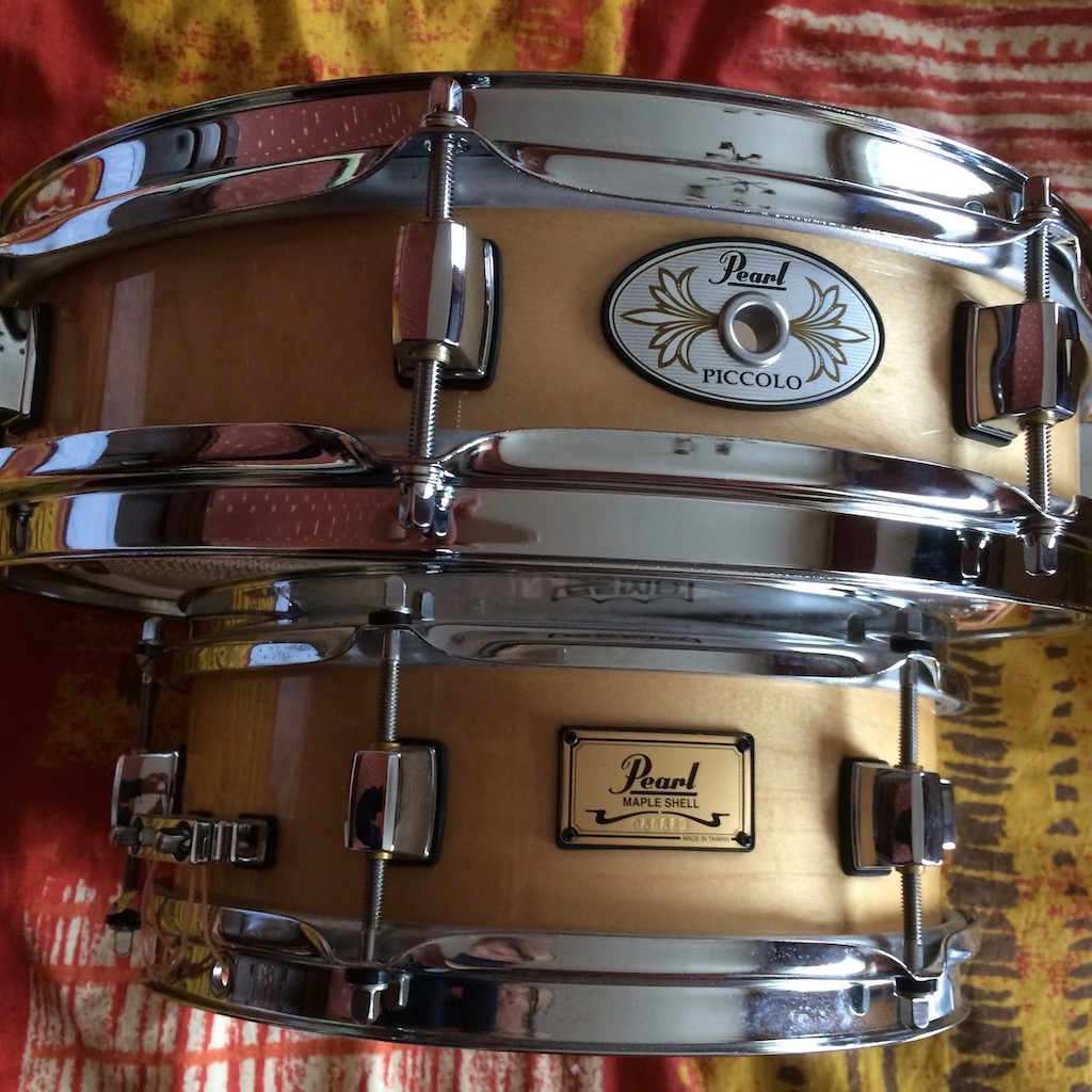 - 1 caisse claire Pearl M1330 : maple 13x3 (2017) / ambassador 2018 bon état/diplomat neuve, timbre d'origine Pearl 20 brins