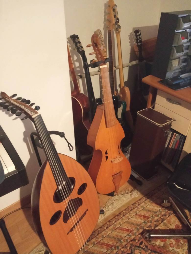 Devant : mon oud, une viole de gambe qu'on me prête puis on devine une 12 cordes Harley Benton, super rapport qualité prix.