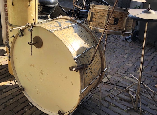 Unfortunately not a whole kit, but just the snare (14 7/32 x 6,5) and bass (27-ish x 14), but an amazing find nevertheless.
