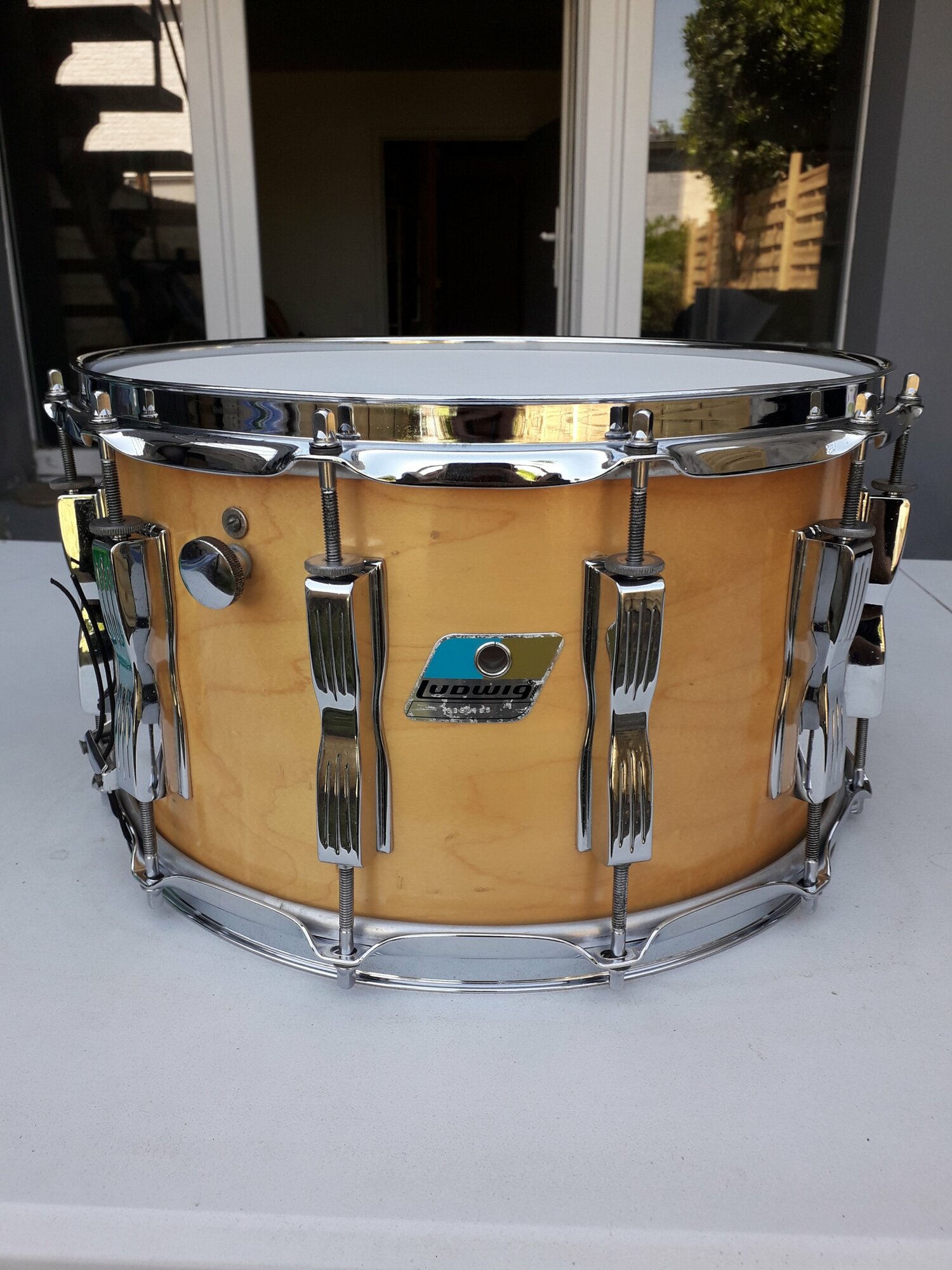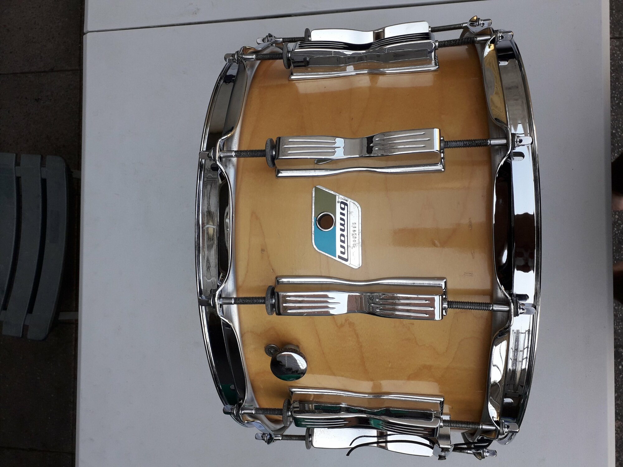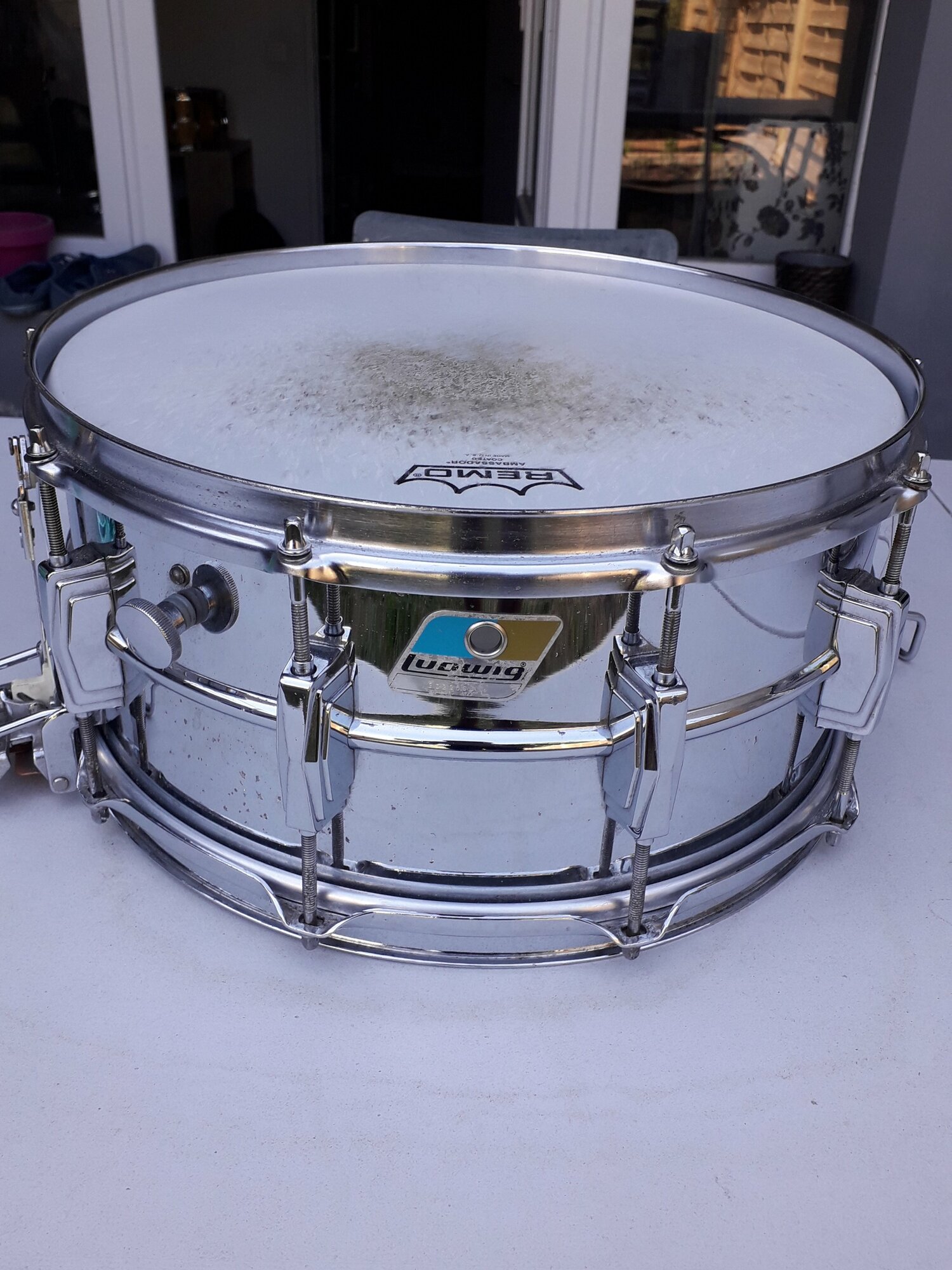 Et bah voilà je fais aussi parti du club, ma première caisse claire Ludwig, une chouette LM411 badge blue/olive avec bords arrondis.