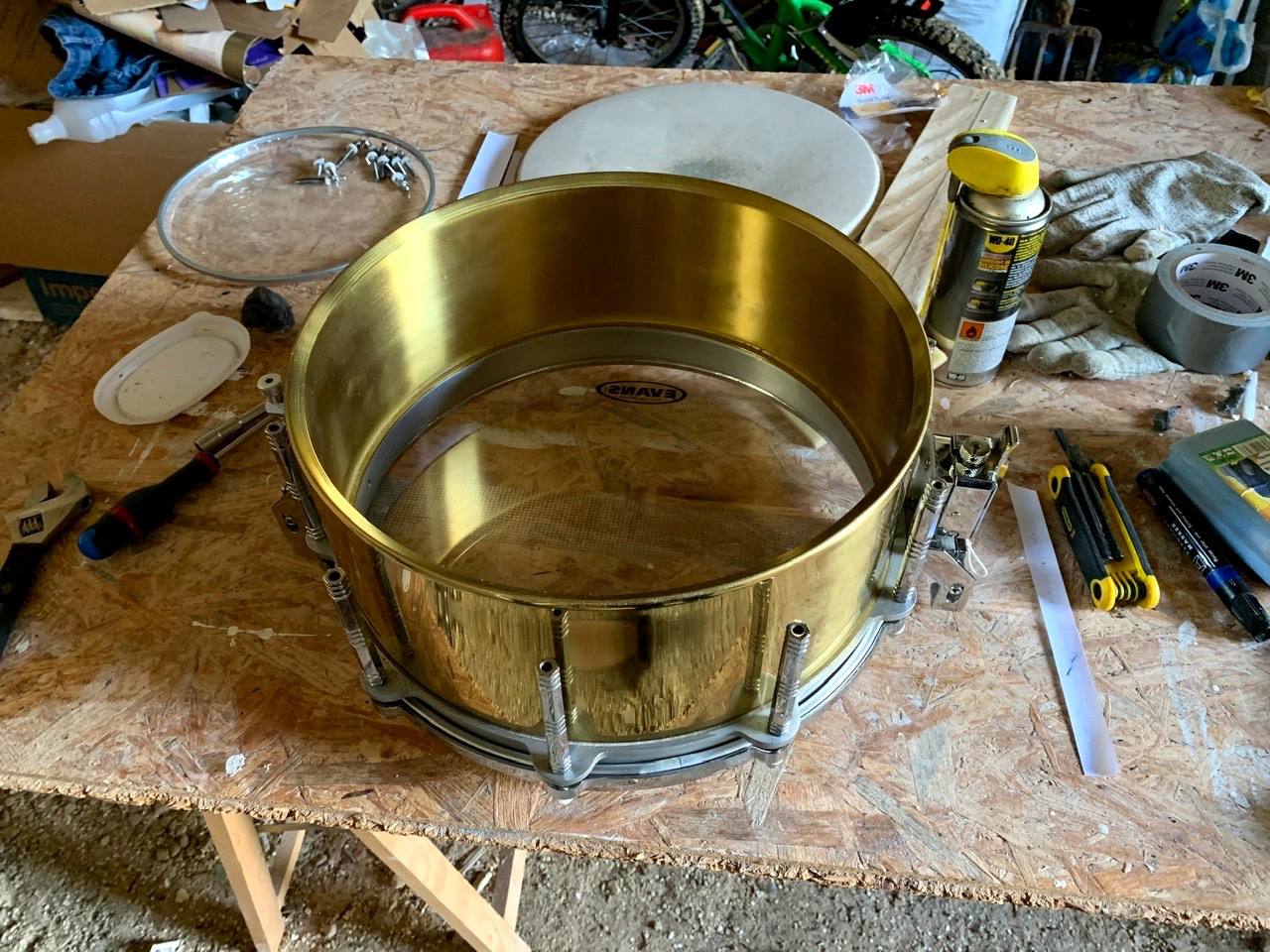 Pour rappel, le principe de la free floating, c’est une structure / base, en alu, qui supporte le mécanisme de timbre, les cheminées pour tirants et accueille la peau de timbre. Là-dessus on pose un fût, libre et non percé dont seul un côté est chanfreiné, et puis on ferme avec la peau et le cercle de frappe.