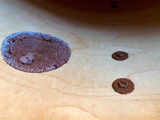 Le coup de la finition me chagrine plus. Soit je laisse en l’état, et on verra des traces comme sur un kit qui a vécu, soit je ponce à blanc et je re-vernis. Mais je crains la mauvaise teinte. Mon vernis incolore n’a pas ce côté chaleureux jaune de l’origine. Je l’ai bien vu quand j’ai teinté l’intérieur de la grosse caisse de la Black Diamond Pearl revenue revenue d’entre les morts du noir.