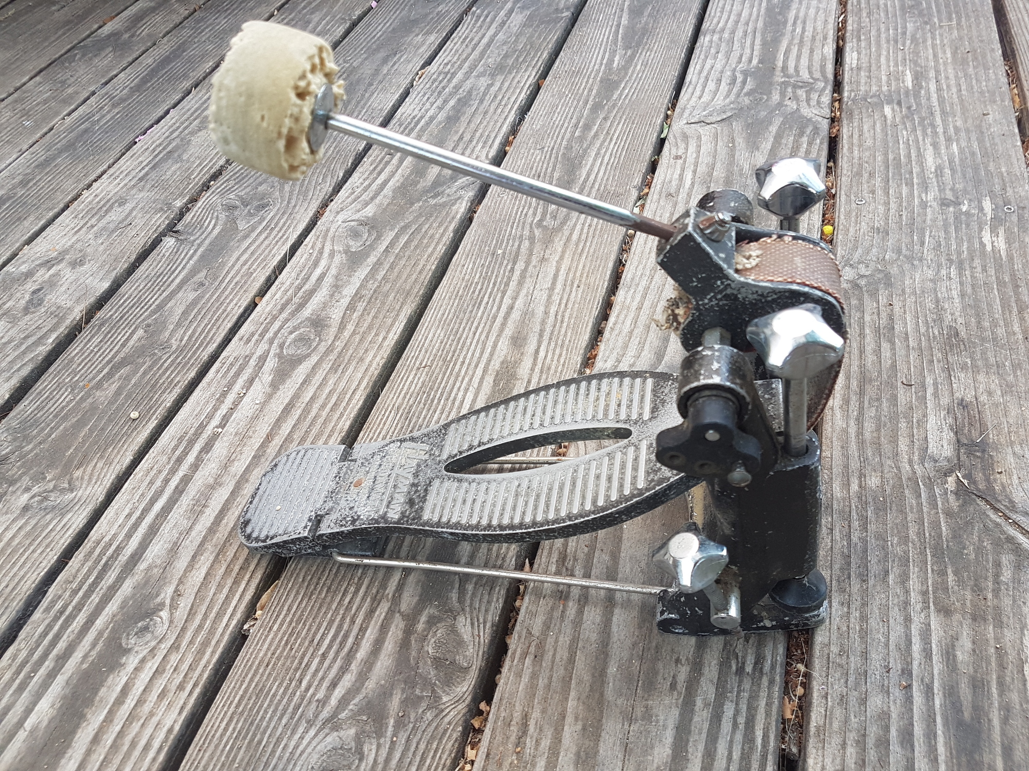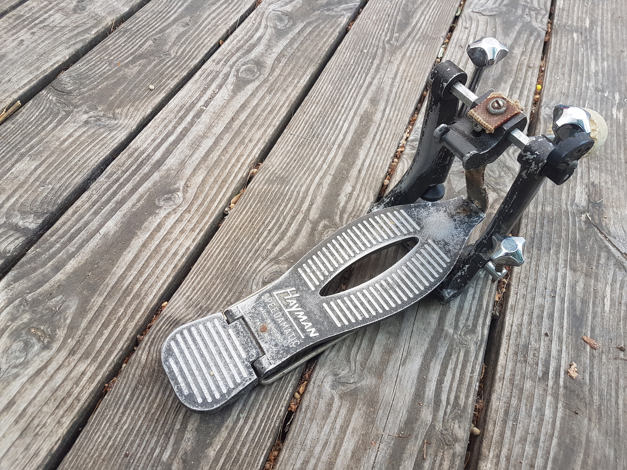 Ce matin, c'était la brocante du village, et là je tombe sur une pédale de grosse caisse vintage. Une Hayman speedamatic! Dans son jus de chez jus..