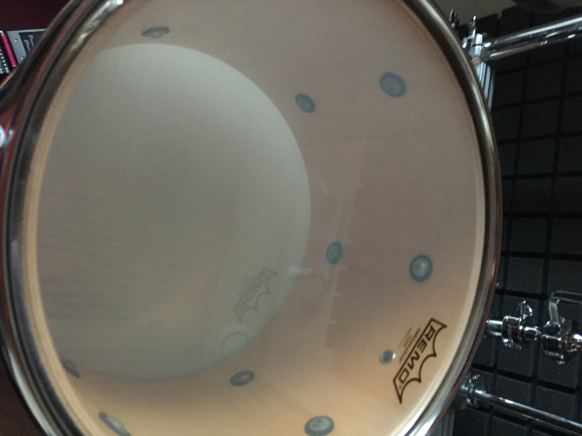 je n'aime pas la tronche du cerclage de grosse caisse au niveau de la protection: on dirait qu'il est brisé. la grosse caisse n'a pas d'éclats de vernis, mais des éclats de placage, et là la Bag' n'a pas fait un boulot de pro (si toutefois ce sont bien eux les responsables). le chanfrein est un chanfrein comme tous les chanfreins: rien à signaler.