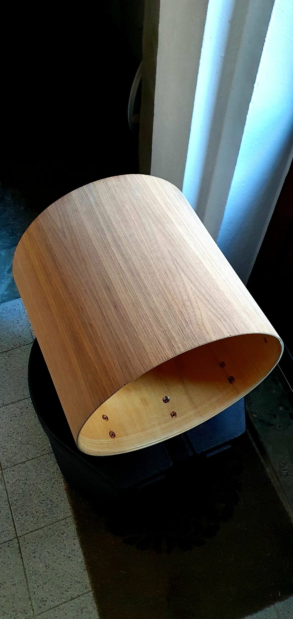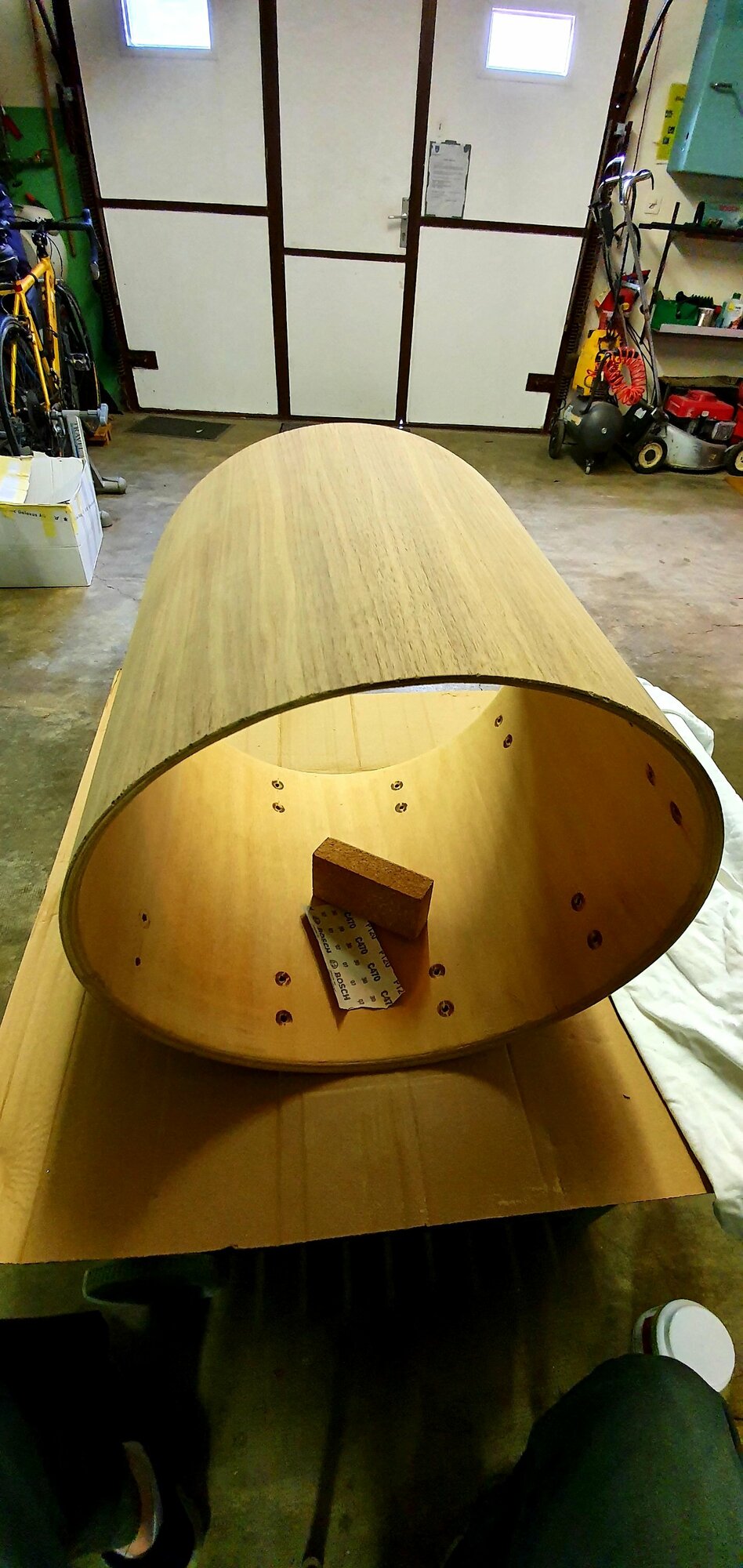 Maintenant le gros du chantier: j'ai envie d'y mettre un splendide placage (un peu comme Evetts drums fait sur ses magnifiques fûts) avec pourquoi pas une bande de marqueterie au centre. Mais c'est hors de mes compétences (ben qu'ayant fait un apprentissage de menuisier étant jeune)