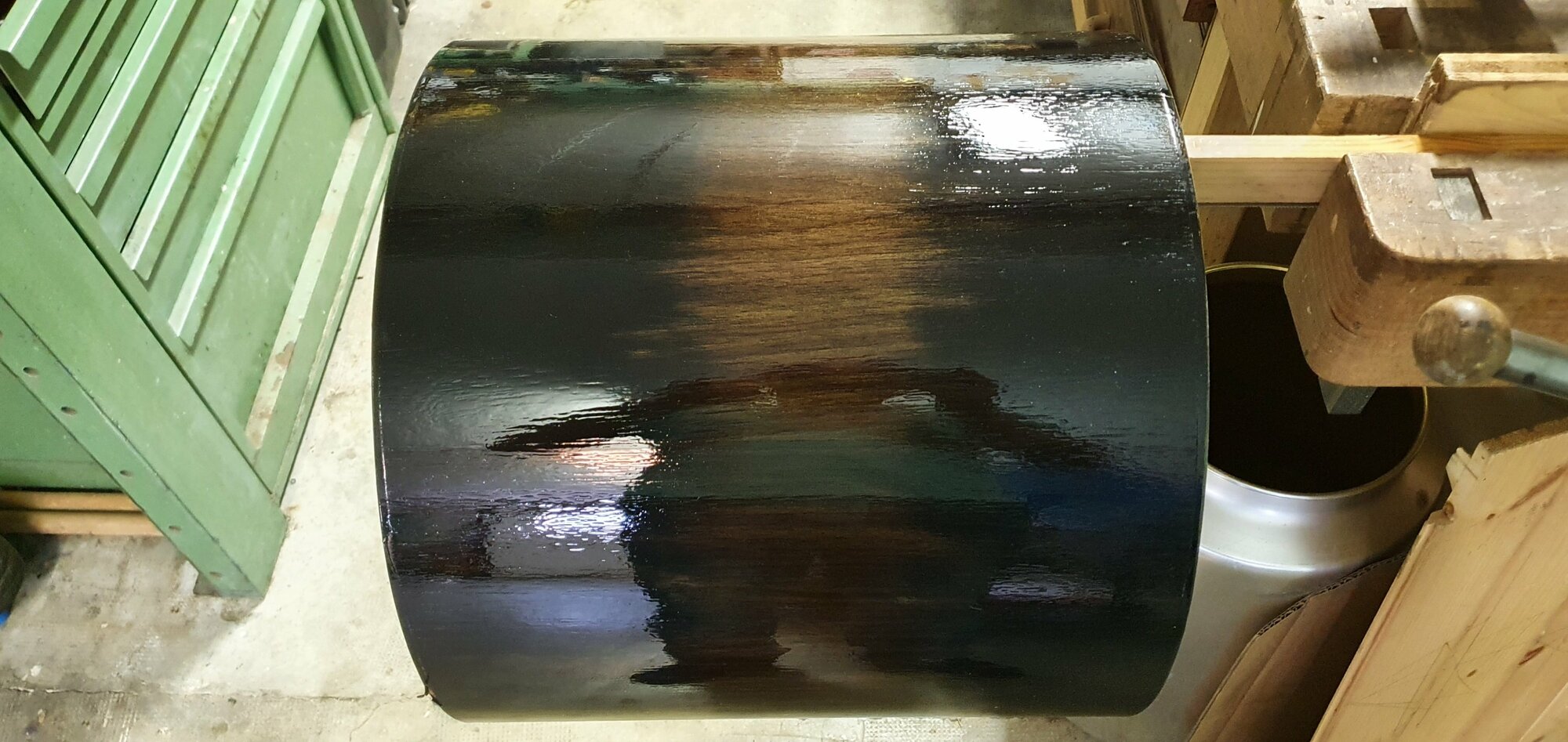 Ça avance bien niveau finition, le voilà après le burst et la troisième couche de vernis polyuréthane brut qui a séchée. (La première étant diluée avec 10% de térébenthine et la deuxième et les suivantes non diluées)