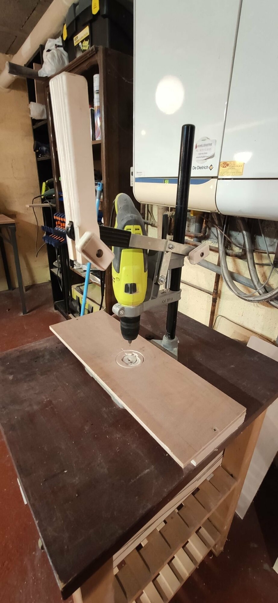 Voici ma perceuse sur colonne, avec option (d)ejection des forêts en cours de perçage, centrage aléatoire vibrant et verrouillage semi-définitif du mandrin pouvant s'enlever avec des pinces multiprises (non fournies). La poignée maison et les papillons en CP améliorent un peu le confort. La nuit je rêve d'une Bosch PBD 40. :coeur: