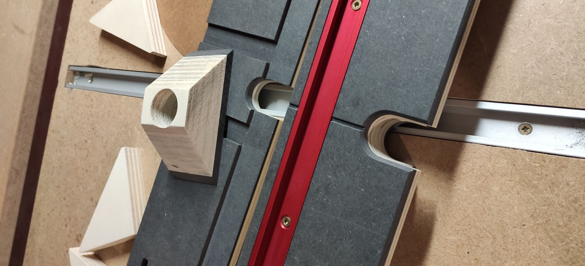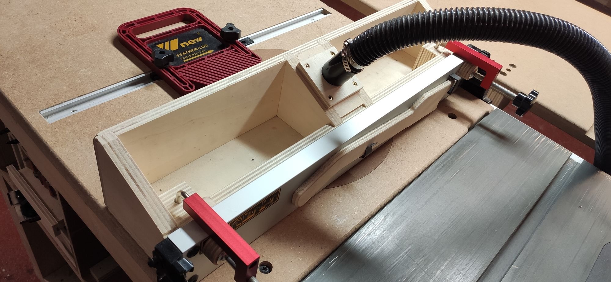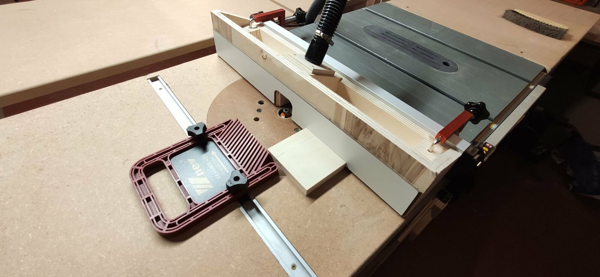 Truc à changer sur le nouveau modèle : attacher le tout au guide parallèle de la scie sur table c'est pratique, mais ça ne permet pas de monter un presseur-peigne (le truc rouge dans le rail) à la vertical pour pousser la pièce à usiner vers la table, trop de jeu. Il faudra donc que le futur guide soit fixé directement à la table de défonceuse sur des rails.