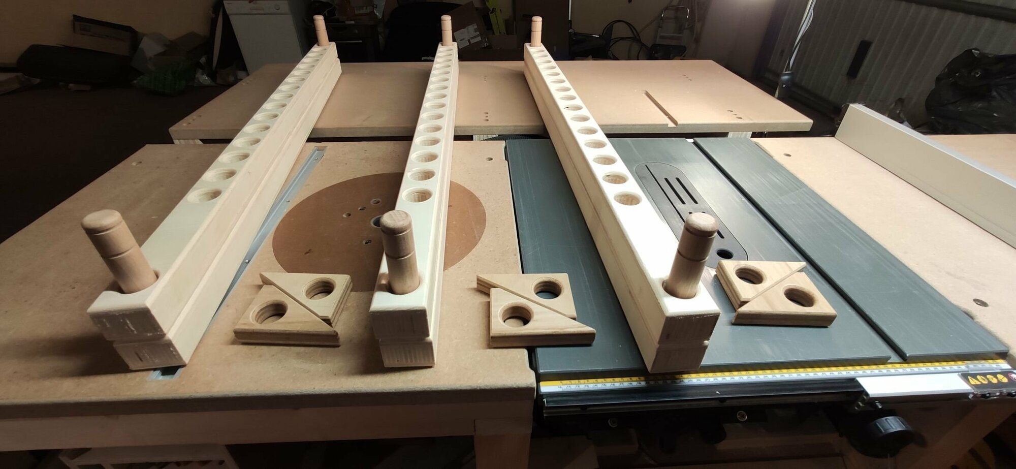 Pour aller encore plus loin, je m’interroge sur l'éclatement du gros combiné en plusieurs meubles. Une surface dédiée défonceuse serait plus pratique au final, et la partie de droite, qui me sert de table d'assemblage et qui n'en fini pas de ne pas voir son système MFT arriver (le prix du kit, même chinois !