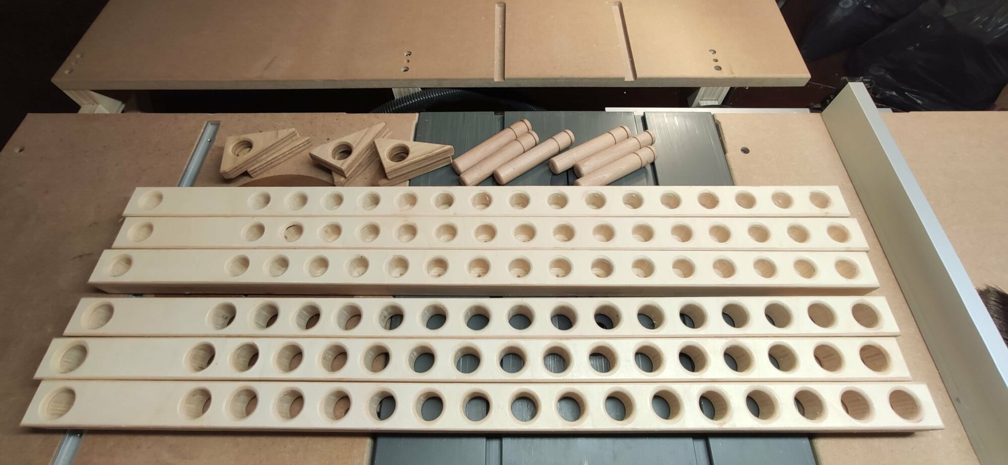 Comme pour le guide d'onglet, j'attrape les chutes d'un plateau Valchromat/CP qui a mal terminé, et c'est parti pour les découpes.