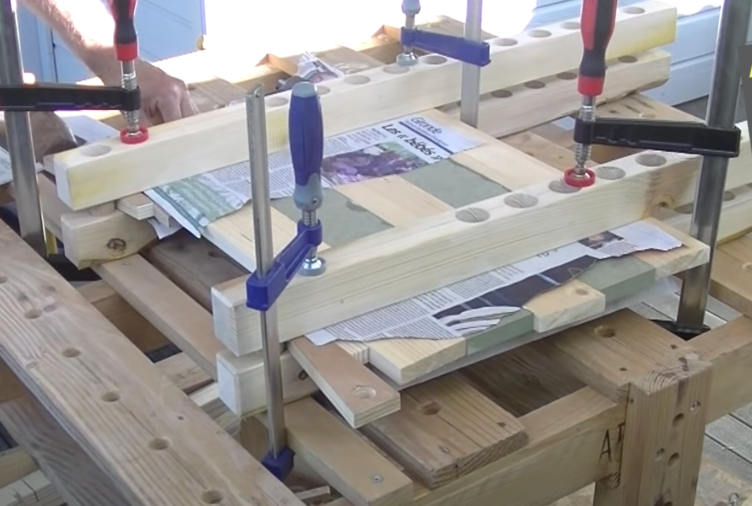 Les barres maintiennent les planches bien à plat à l'aide des serre-joints, pendant que des cales les pressent entre elles. Plus qu'à découper les côtés pour avec des bords bien droits, à poncer le tout et on a un plateau.