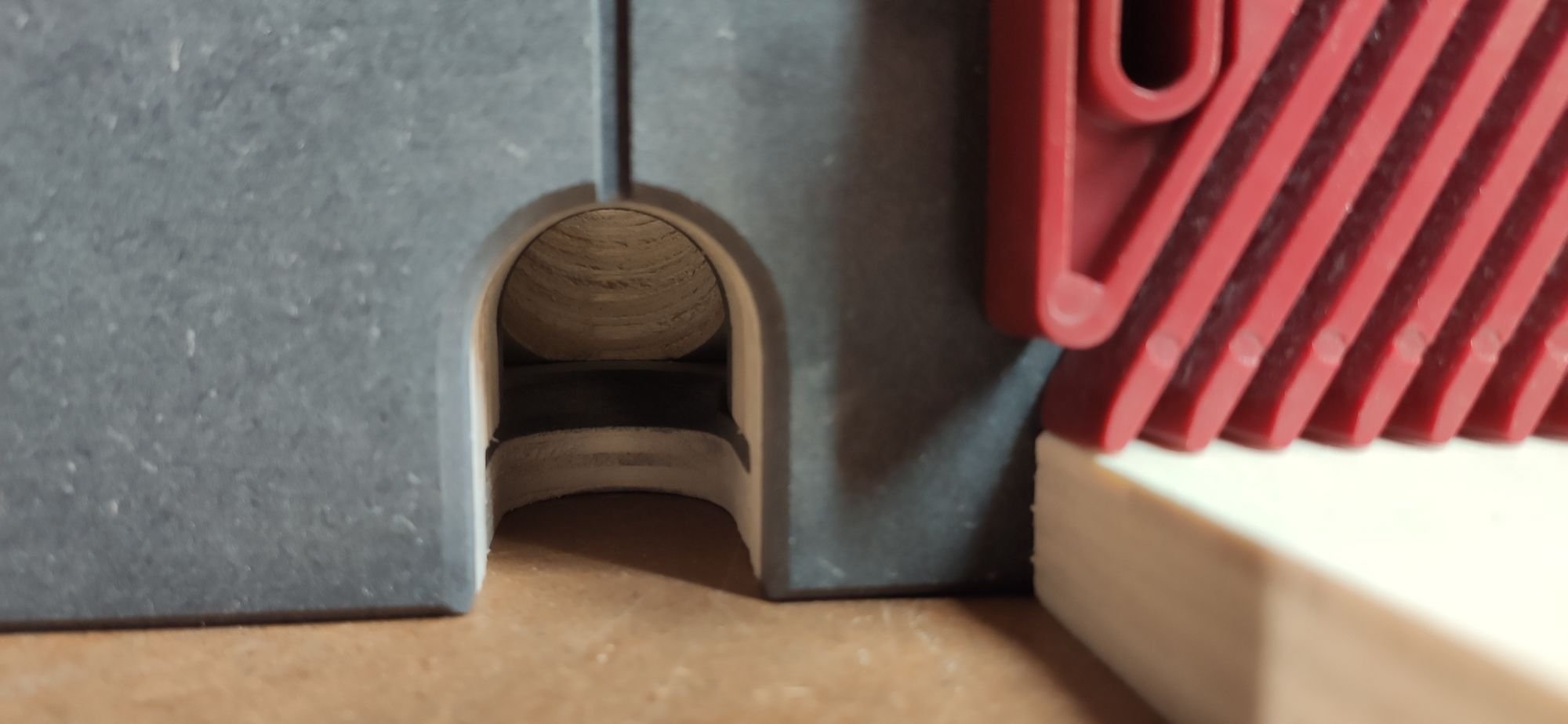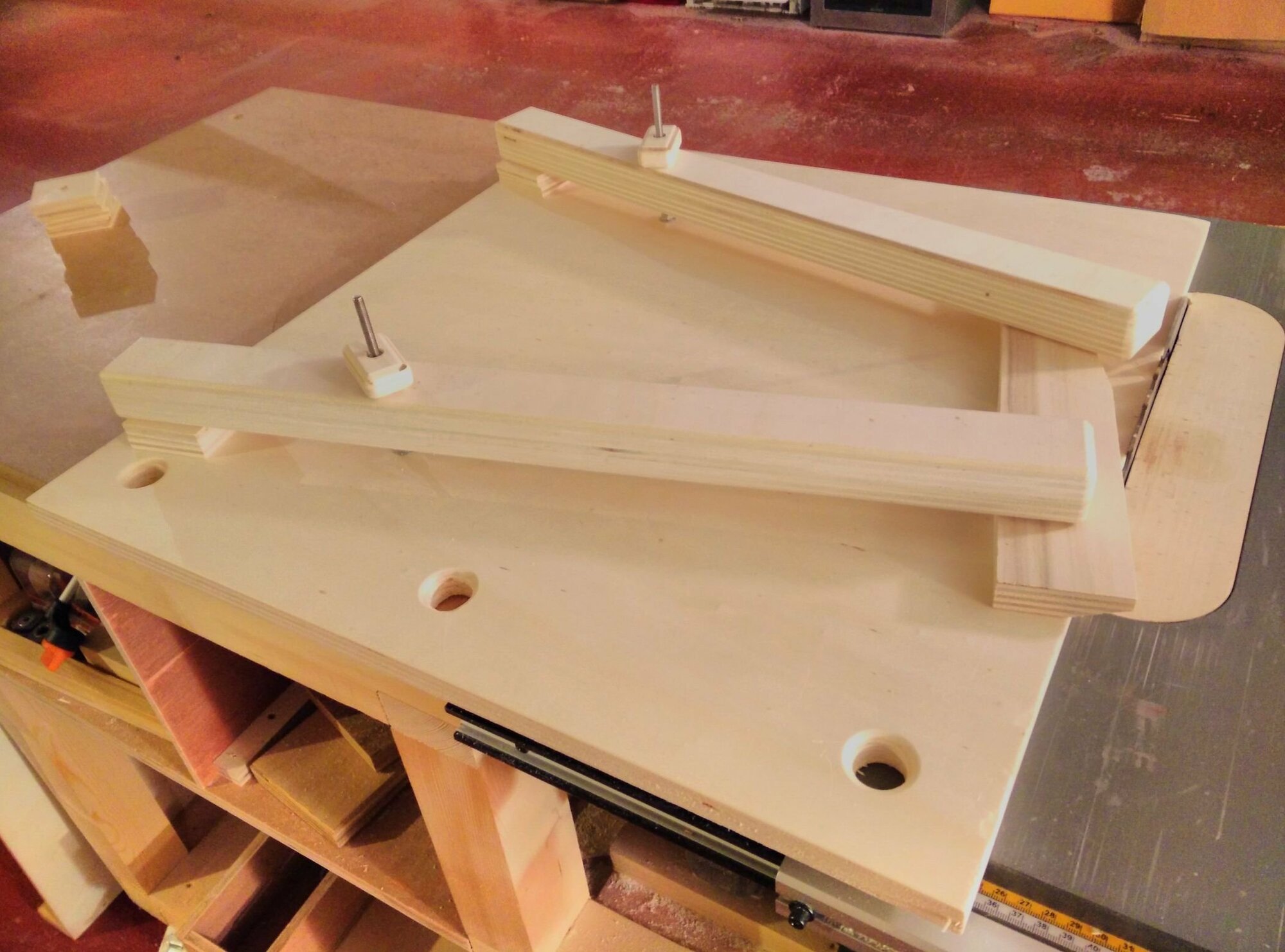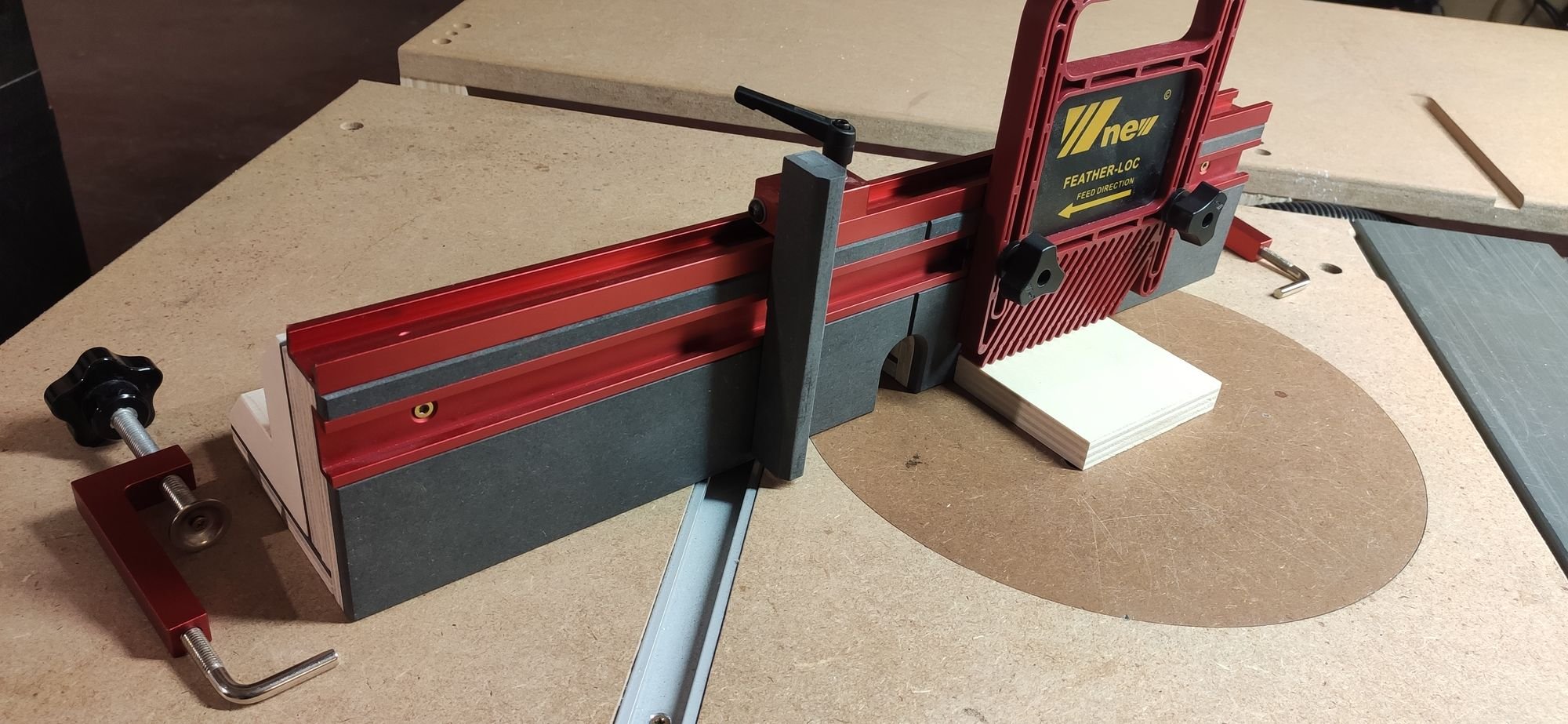 Truc à changer sur le nouveau modèle : attacher le tout au guide parallèle de la scie sur table c'est pratique, mais ça ne permet pas de monter un presseur-peigne (le truc rouge dans le rail) à la vertical pour pousser la pièce à usiner vers la table, trop de jeu. Il faudra donc que le futur guide soit fixé directement à la table de défonceuse sur des rails.