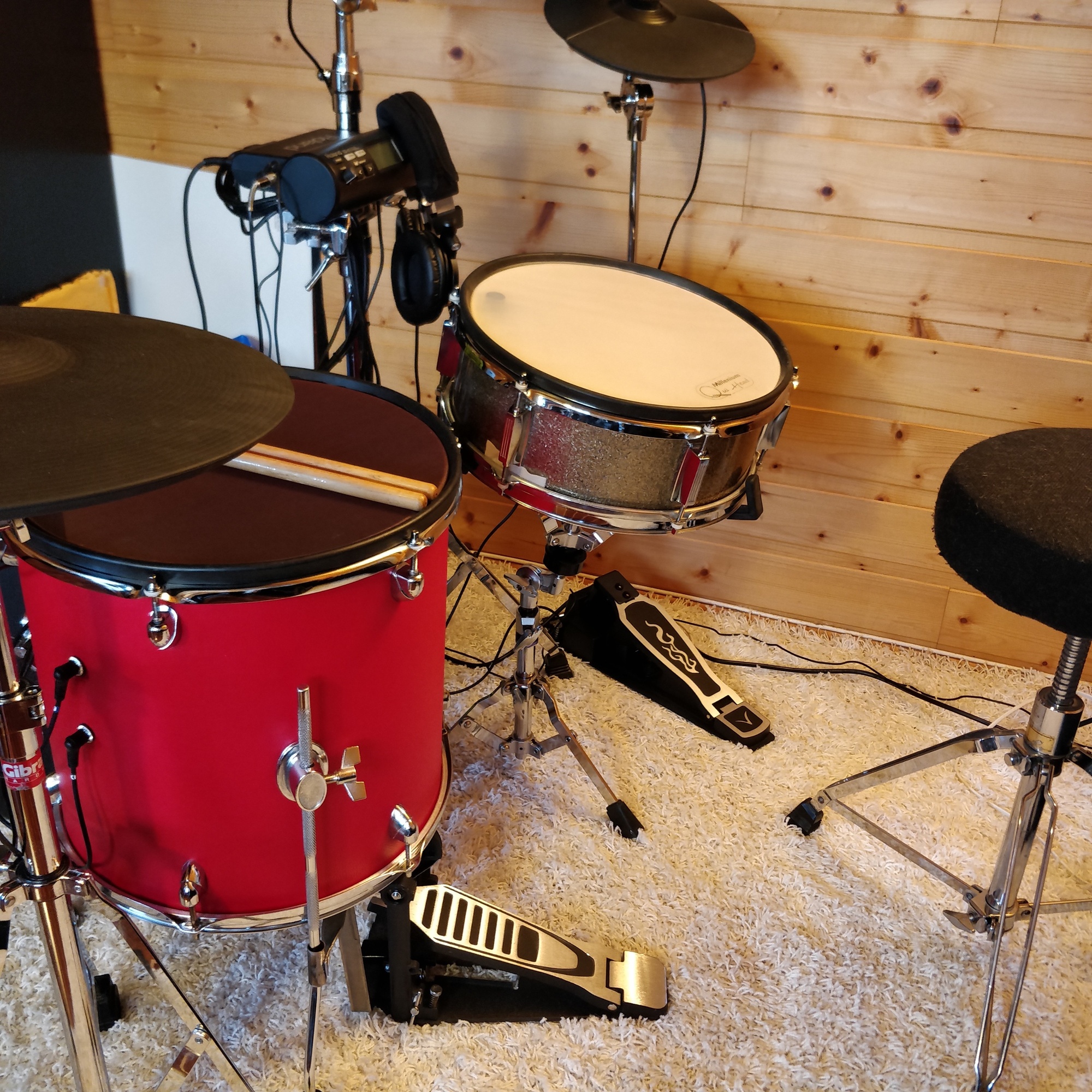 Pour la CC : une tranche d’un tom de 13" qui trainait par là et un Triggera Intrigg qui marche bien en double zone