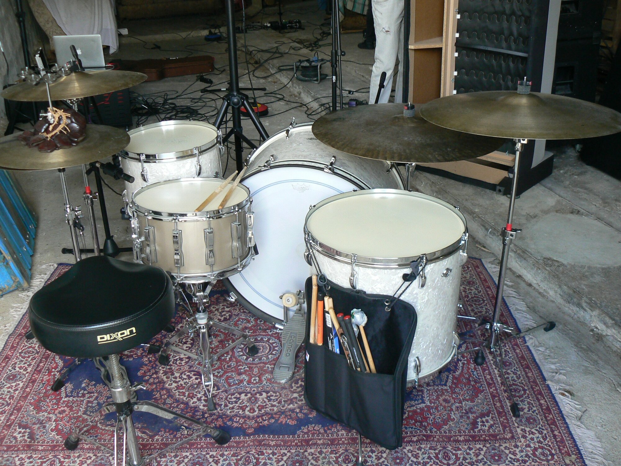 24/13/16/18 en 6 plis LM411, hh thin crash 15/marching 15, ride 24 avedis 70's, et deux ride avedis de 20 transformées en crash et appairées par Johan.