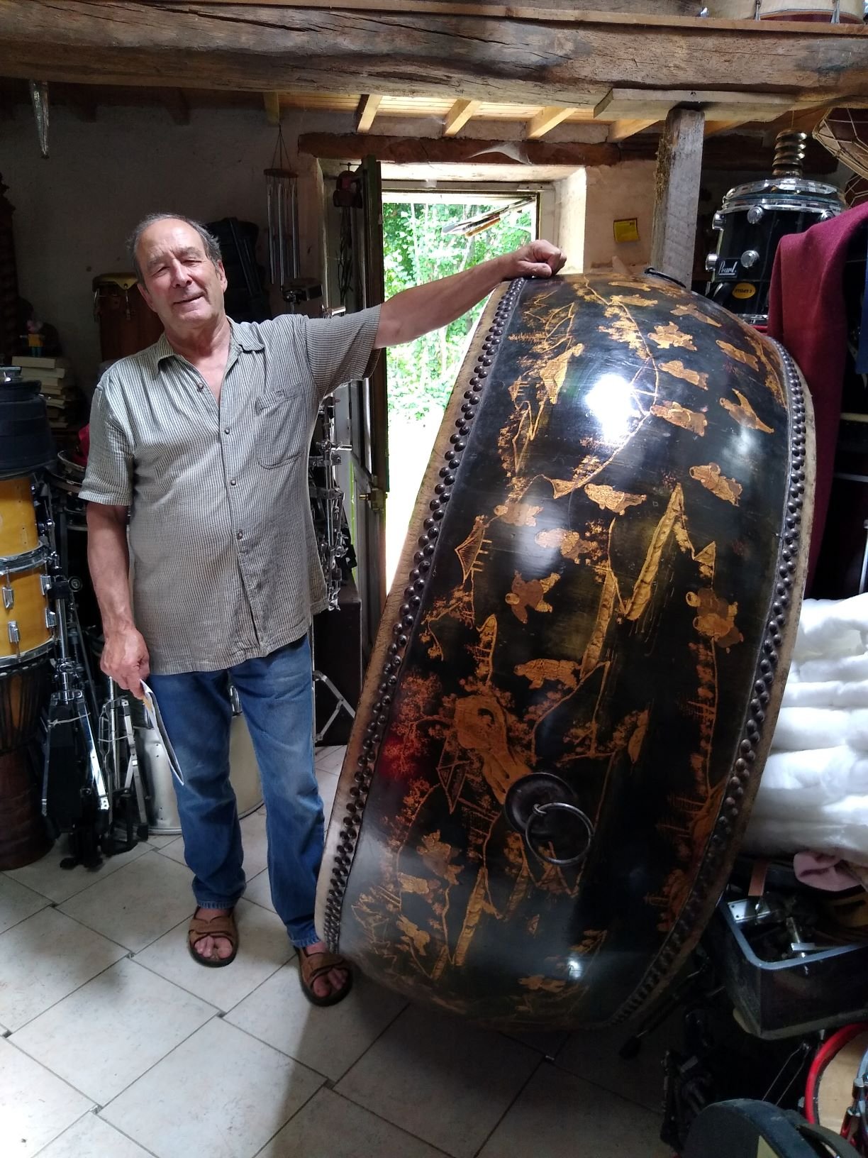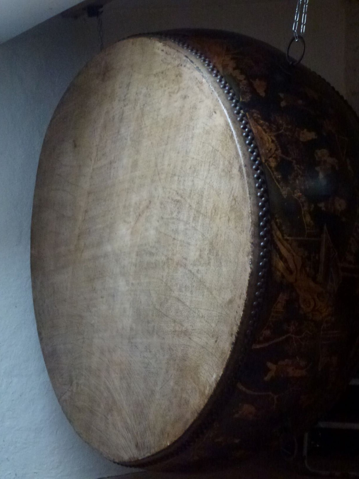 Pour moi c'est un tambour de rituels de temple bouddhiste. Il est très différent (moins épais et plus petit) de ce que j'ai pu voir au Japon dans les temples, mais doit avoir la même fonction.