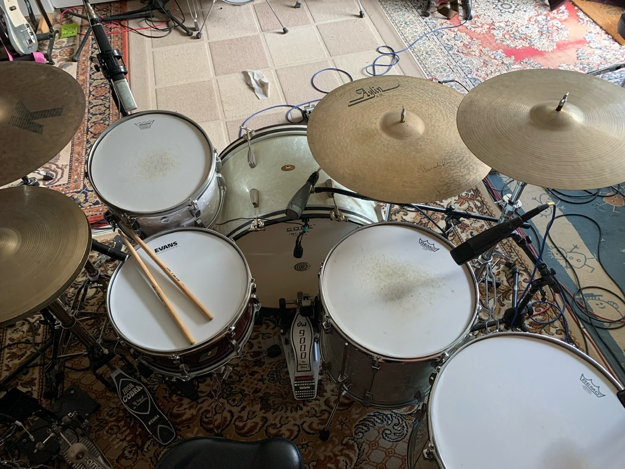 voici ma Gretsch USA debut 80 drop G 18/12/14" cc Gretsch rosewood 14x8" et 14x6.5" pearl custom classic , cymbales Zildjian K d'istanbul et avedis 50's lors d'un enregistrement au funk you studio ...