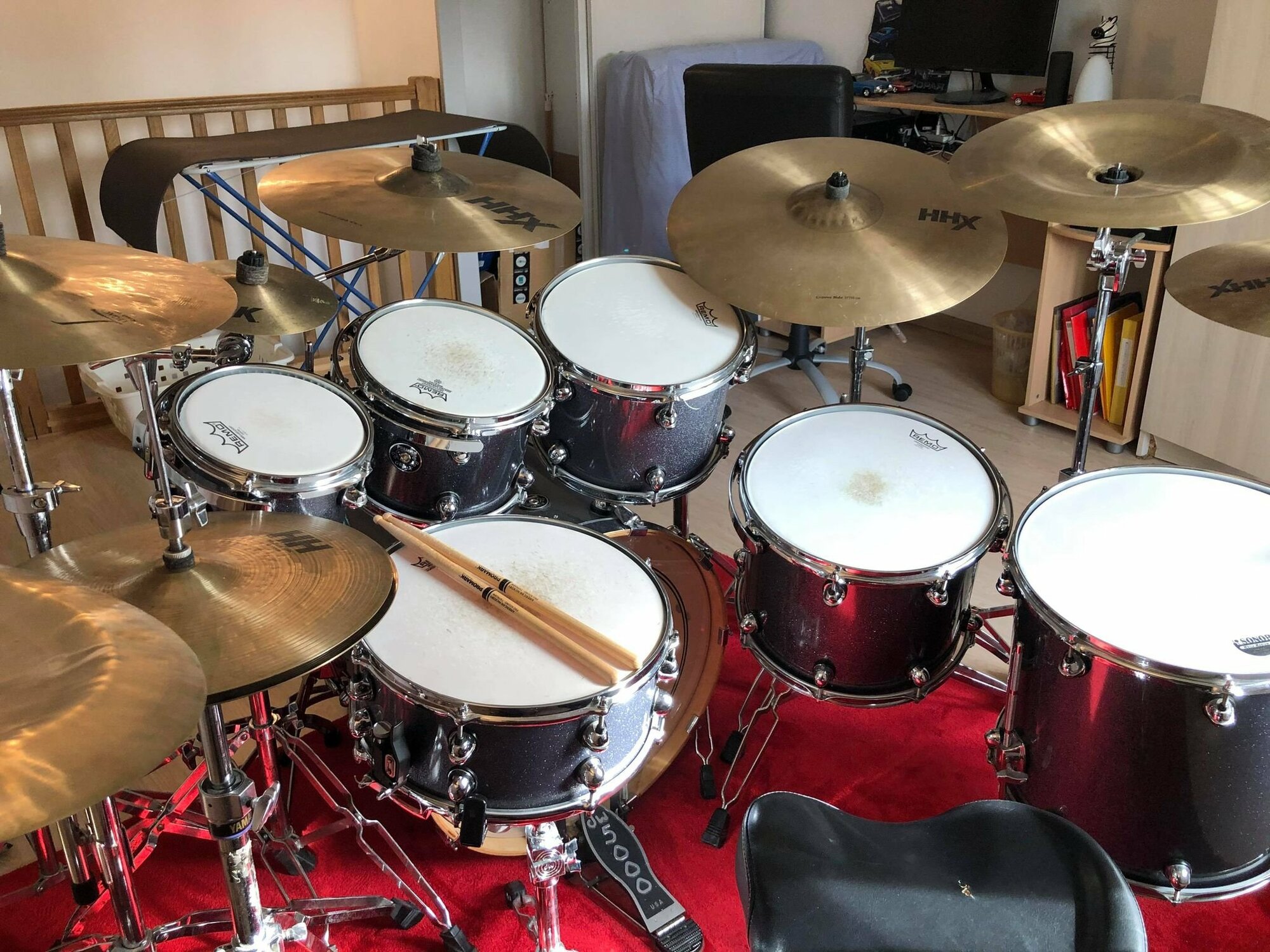 Sacré kit, je vous rassure je ne joue pas tout en même temps, mais j'aime bien avoir le choix des fûts, et j'ai vraiment eu un coup de bol d'acheter ce kit avec le tom de 8 fourni dés le départ, c'est très rare.