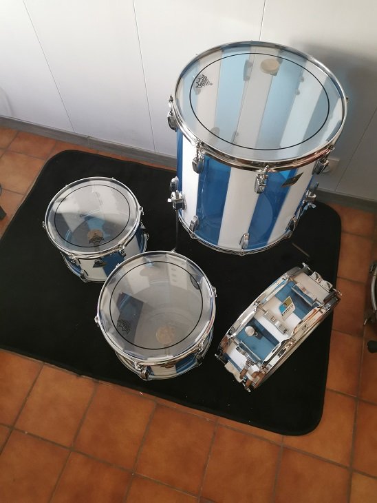 Pour la petite histoire, c'est mon guitariste qui m'appelle un jour, et me dit "j'ai récupérer du matos viens vois si il y a quelque chose qui t'intéresse.." je me suis donc servi 24/18/14 Rogers, et Ludwig pattern F 12/13/16 + CCl 14X5........(manque la GC) :coeur: