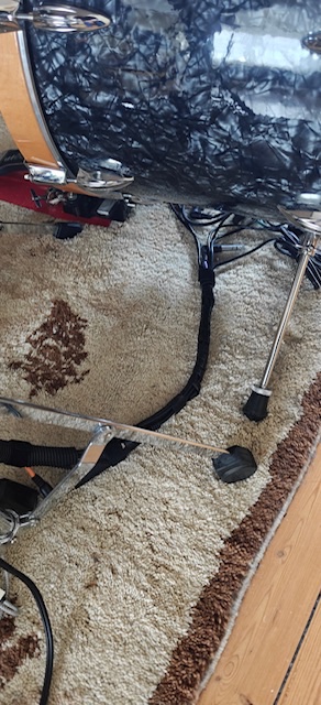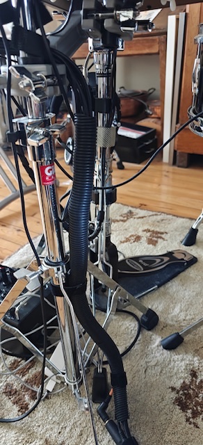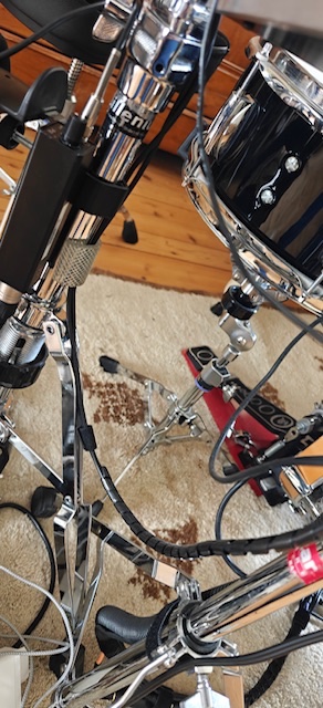 Sur mon kit, j’ai fait en sorte de les masquer le plus possible en velcrotant sur les pieds de cymbale, en rassemblant plusieurs câbles dans une gaine souple, en passant par le dessous de la GC et si nécessaire au moyen de rallonges de câble. L’aspect visuel est très plus bô.
