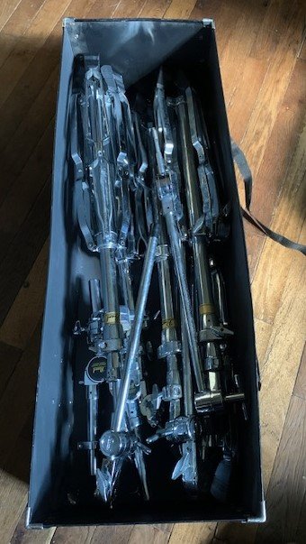 La snare est une pearl brass shell (14x 6.5 ?), il y a tous les pieds de cymbales avec son flight case, hh , double pedale gc , le pied avec l’attache pour le tom 14. Quelques cymbales dont une Paiste 2000, crash 18, la charley 14 paiste 505 et qqs no name ( genre « super » made in germany etc… )