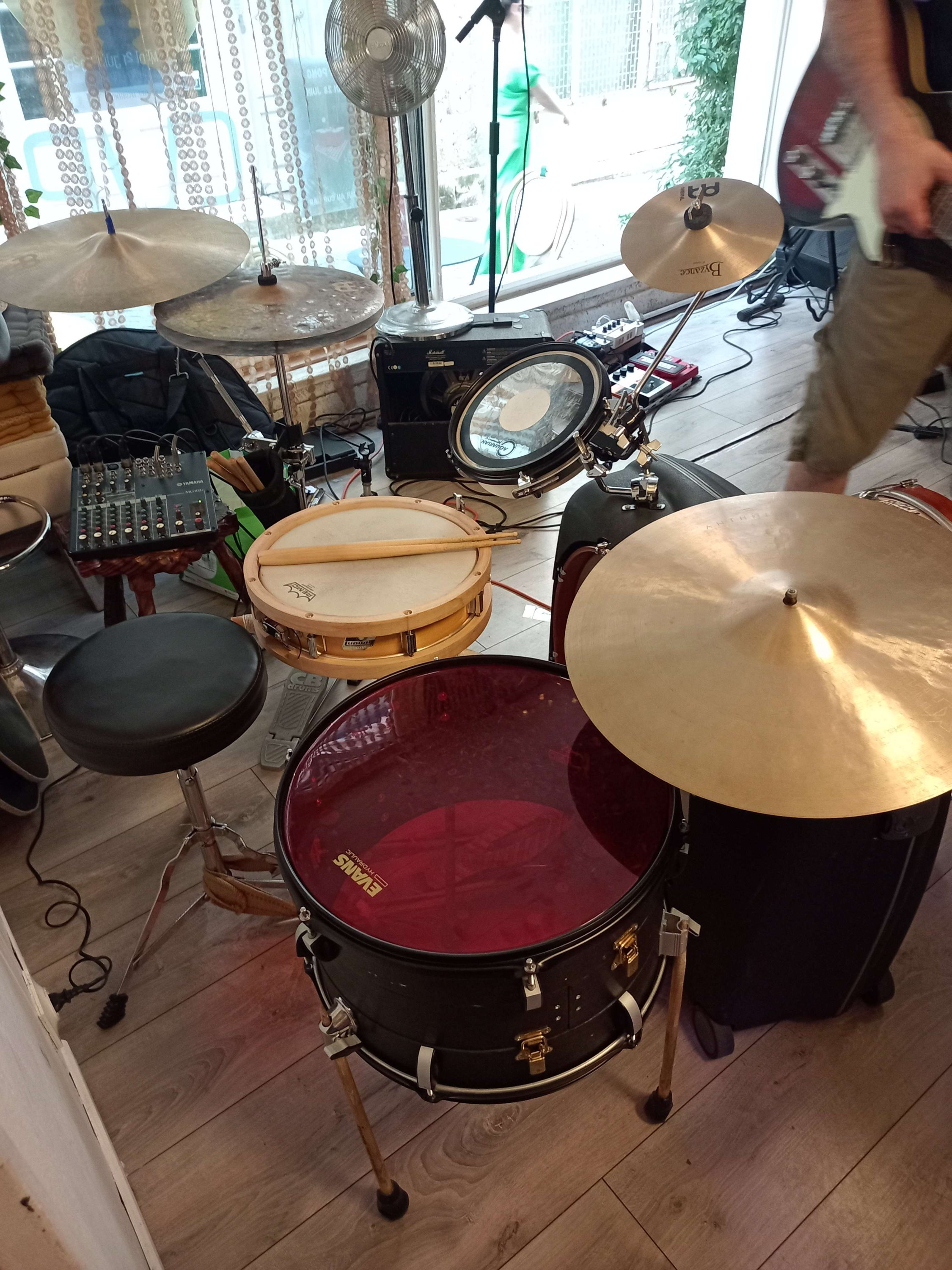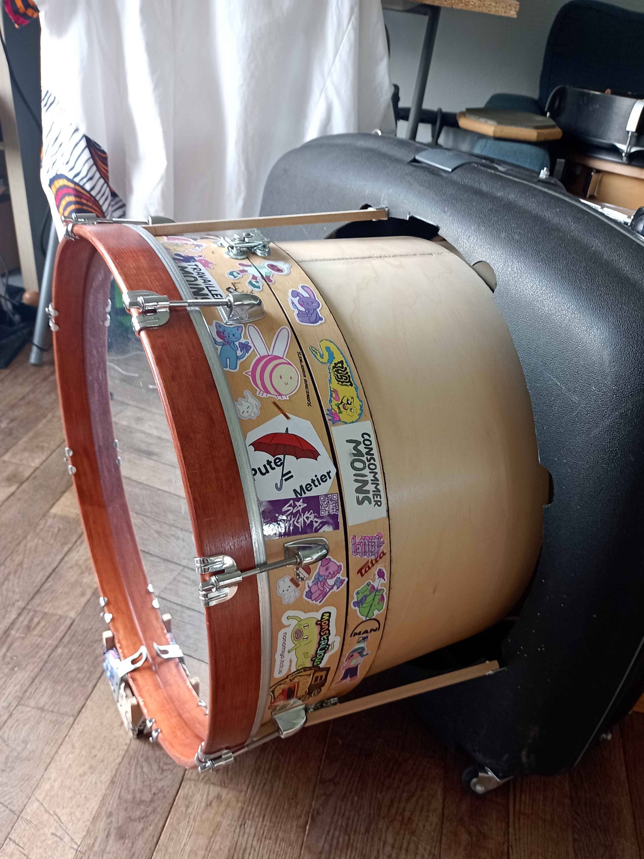 J'ai pas encore eu l'occasion de l'enregistrer, mais le volume est en effet un peu meilleur maintenant, quoique quand même un peu faiblard, peut-être que cette peau n'est aussi pas le meilleur choix. C'est une de ces peaux 'gratuites' qu'on a avec les kits, et puis aussi c'est une peau de grosse caisse, alors que le fut et d'un tom, j'ai l'impression du coup que la peau ne se s'assieds pas très bien dessus... Je vais essayer avec une peau de tom qui traine.