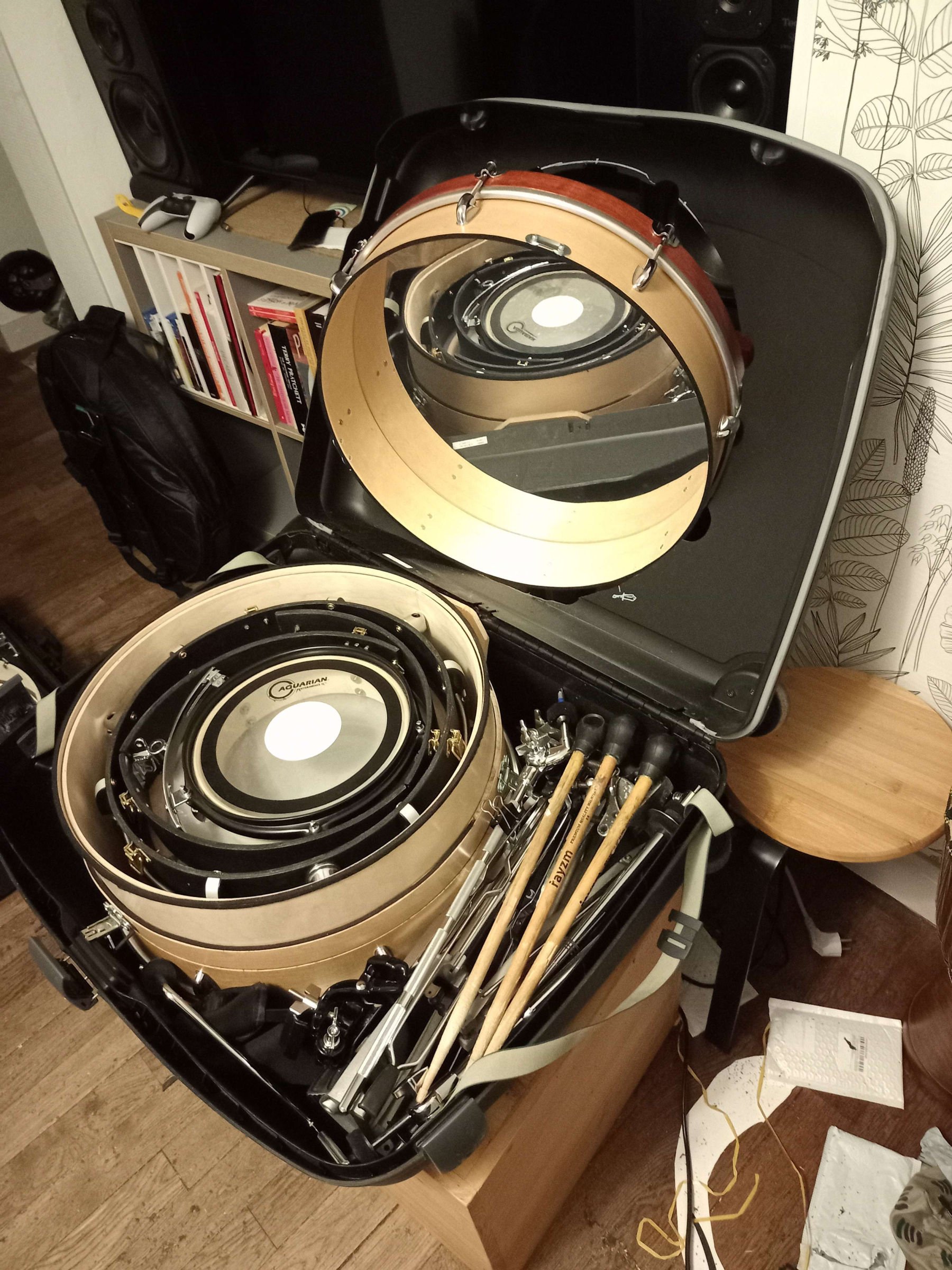 Techniquement je pourrais mettre les cymbales dedans, mais cette fois c'est trop lourd à porter! On est sur du 25 kilos tout rempli. Sans les cymbales!
