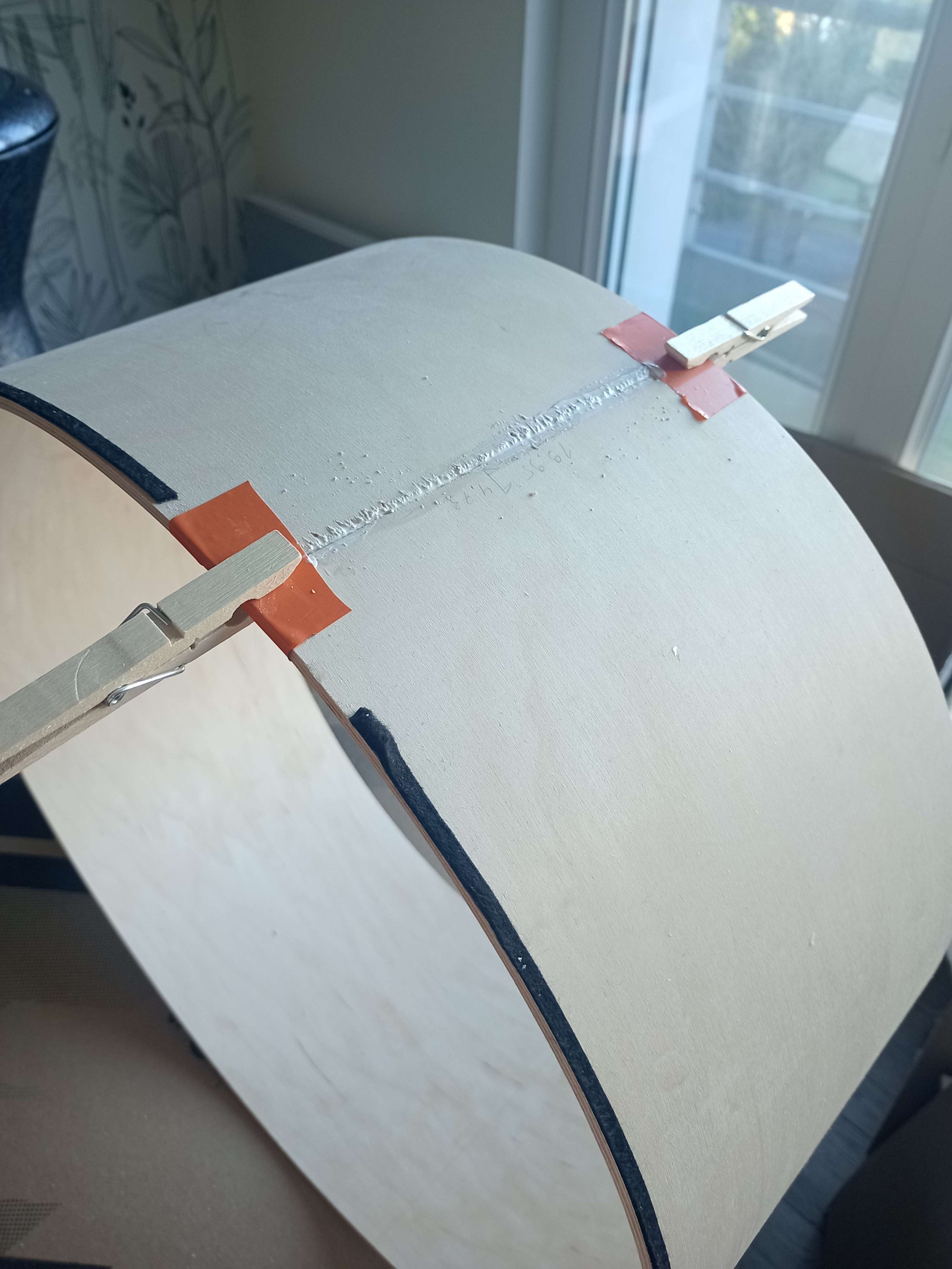 (Le cerclage est un peu moche parce que c'est en fait aussi un bout du fût en 16, que j'ai aggrandit contre sa volonté avec de la colle à bois, j'était tenté d'acheter un cerclage de grosse caisse, mais bon, un peu cher pour quelque chose que je vais bousiller direct...)