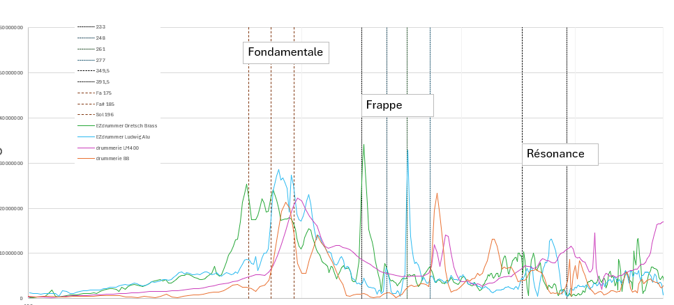 Après accordage 261/392 ça sonne bien avec pas mal d'overtones. Je fais le choix de les remplacer immédiatement par des formats connus = remo 300 en dessous, Evan genera dry au dessus. ça pourra m'éviter des mauvaises surprises, et puis pourquoi pas garder le joli logo intact au cas où.