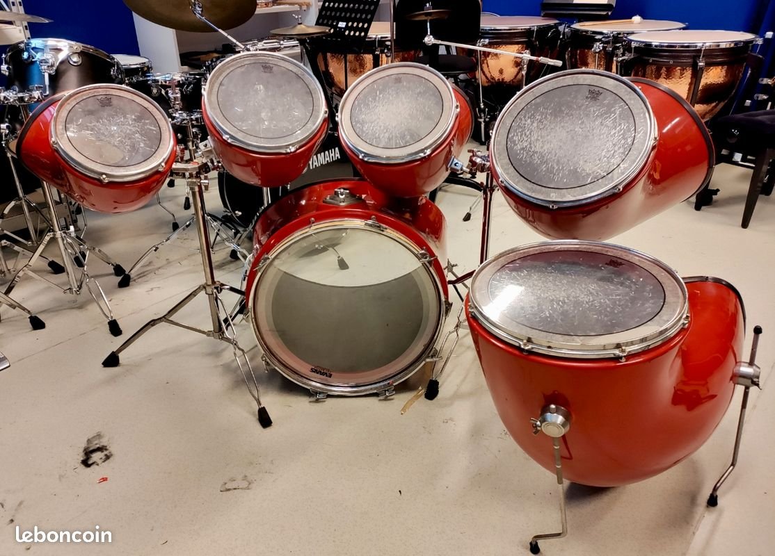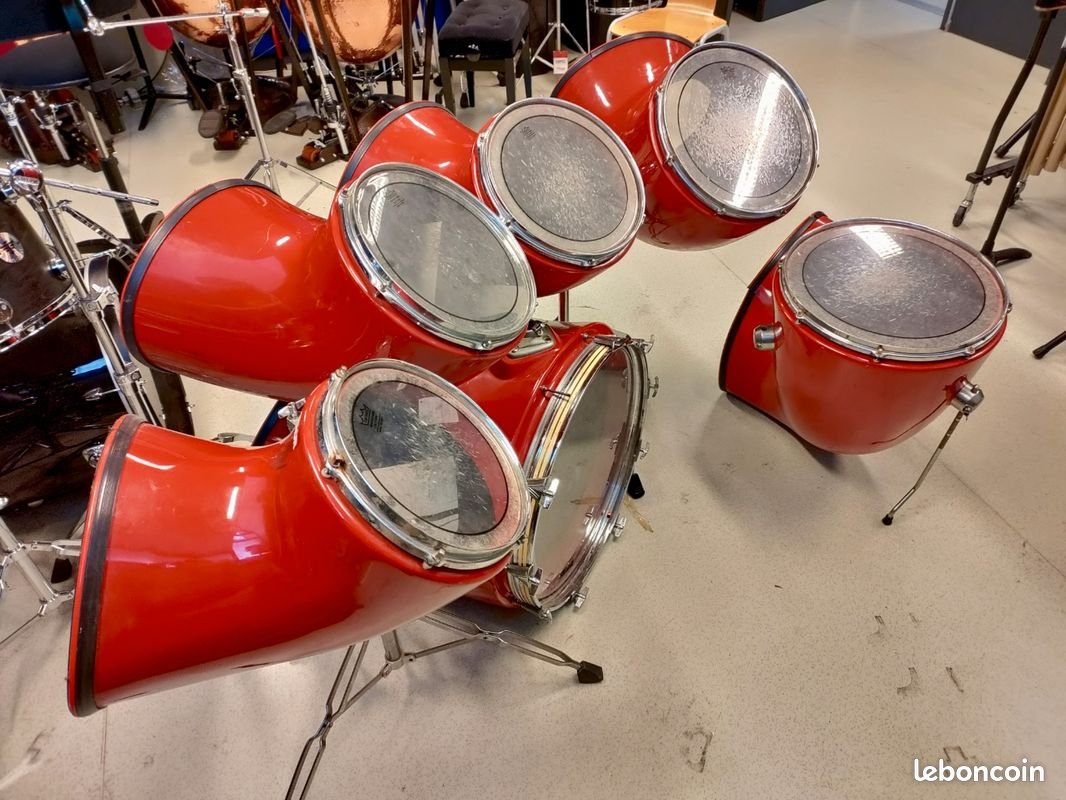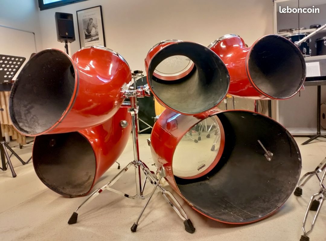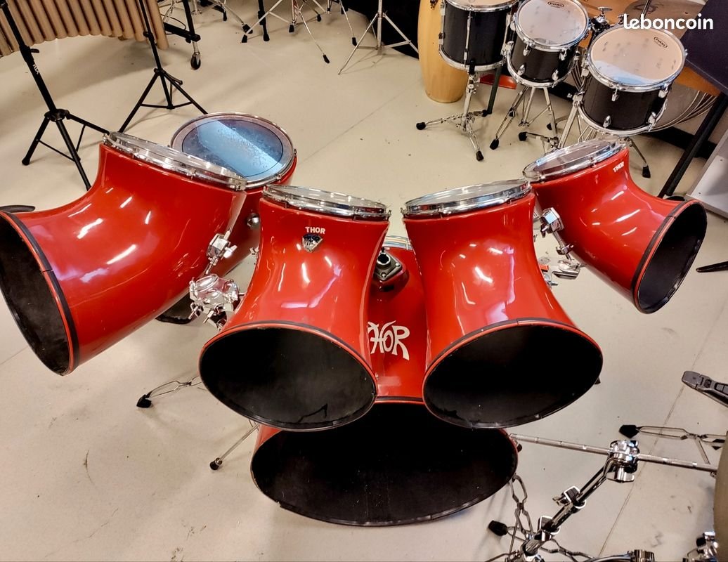 Un kit atypique: 10" 12" 12" 14" 16 "22 " en mat fibre de verre/résine moulée, de marque THOR, fortement inspiré de North Drums et de Zickos,