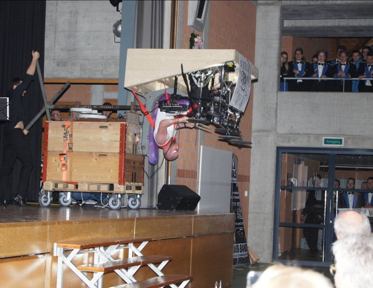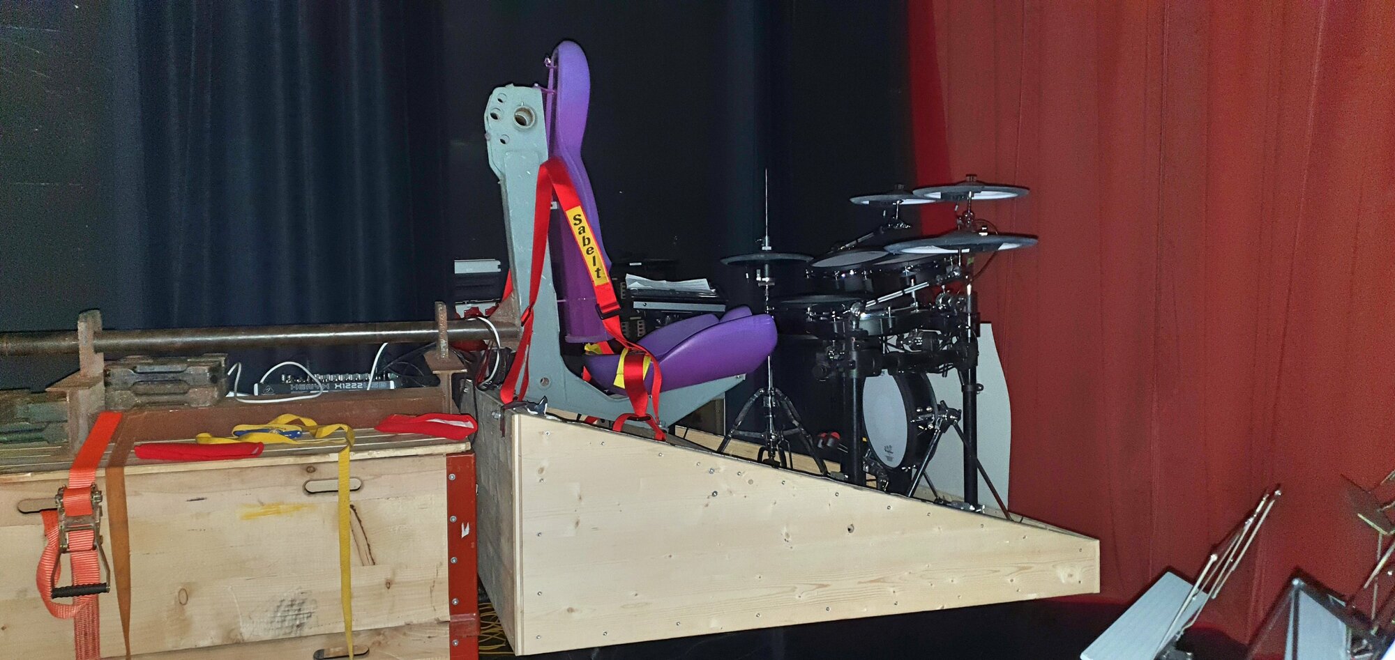 Du coup, avec un charpentier et 2 menuisiers dans le registre de la percussion ça été résolu (vendredi) assez rapidement vu le timing hyper serré. Verdict: nouvelle structure vachement plus solide pour supporter le poids.... oui mais voilà : qui dit solide dit lourd du coup gros problème de stabilité et donc on a dû trouver pour le lendemain des contrepoids (350kgs 😲) et zou le lendemain j'étais en piste pour le concours avec déjà des bleus sur les épaules dû à la tension de malade que j'avais mis sur les harnais pendant les répétitions, écrasé contre le siège que j'étais, le moindre mm de jeu donne une sensation d'insécurité donc pas le choix.