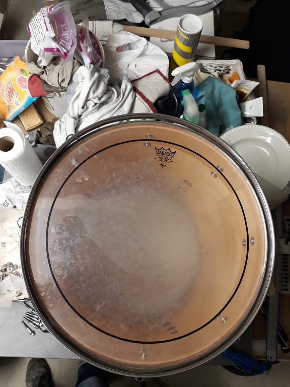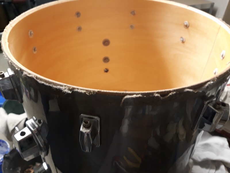 Avant de faire la réparation du tom basse et réduire sa fracture j’avais donné un petit coup de jeune au fut, et surtout enlever un peu la poussière qui état collé dessus :