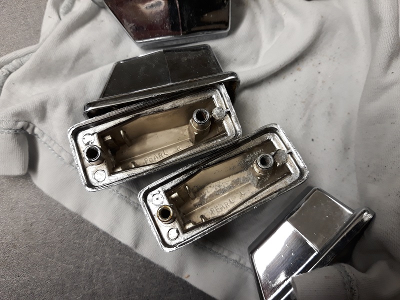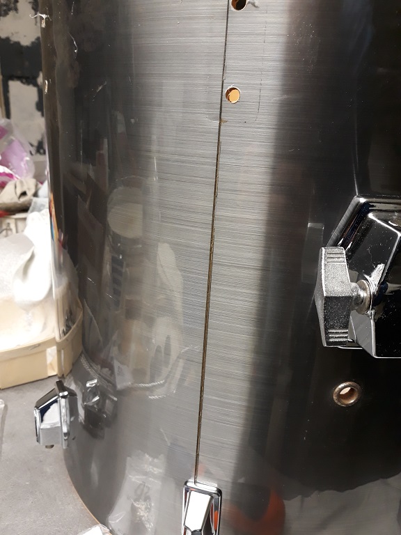 Comme pour les autres coquilles, il y a à l’intérieur comme un résidus de métal, je pense résultant de l’oxydation du métal. Drumatic avait rencontré le même problème avec ses coquilles sur une caisse claire Tama Superstar, et avait résolu le problème en leur faisant prendre un bain dans du vinaigre additionné de bicarbonate.