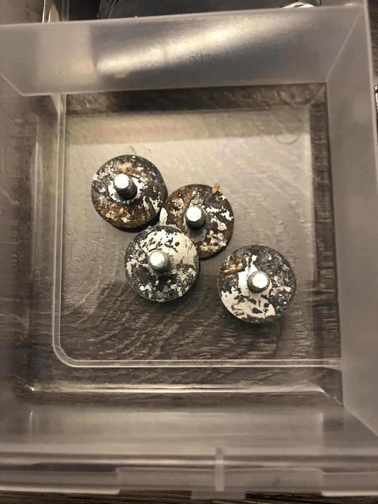 Pour décrasser les coquilles et tirants tu peux aussi les passer dans un bain de vinaigre/bicarbonate de soude et frottage avec une vieille brosse à dent (30 secondes ou un peu plus pour celles bien crados), puis rinçage avec une peu d'eau et séchage.