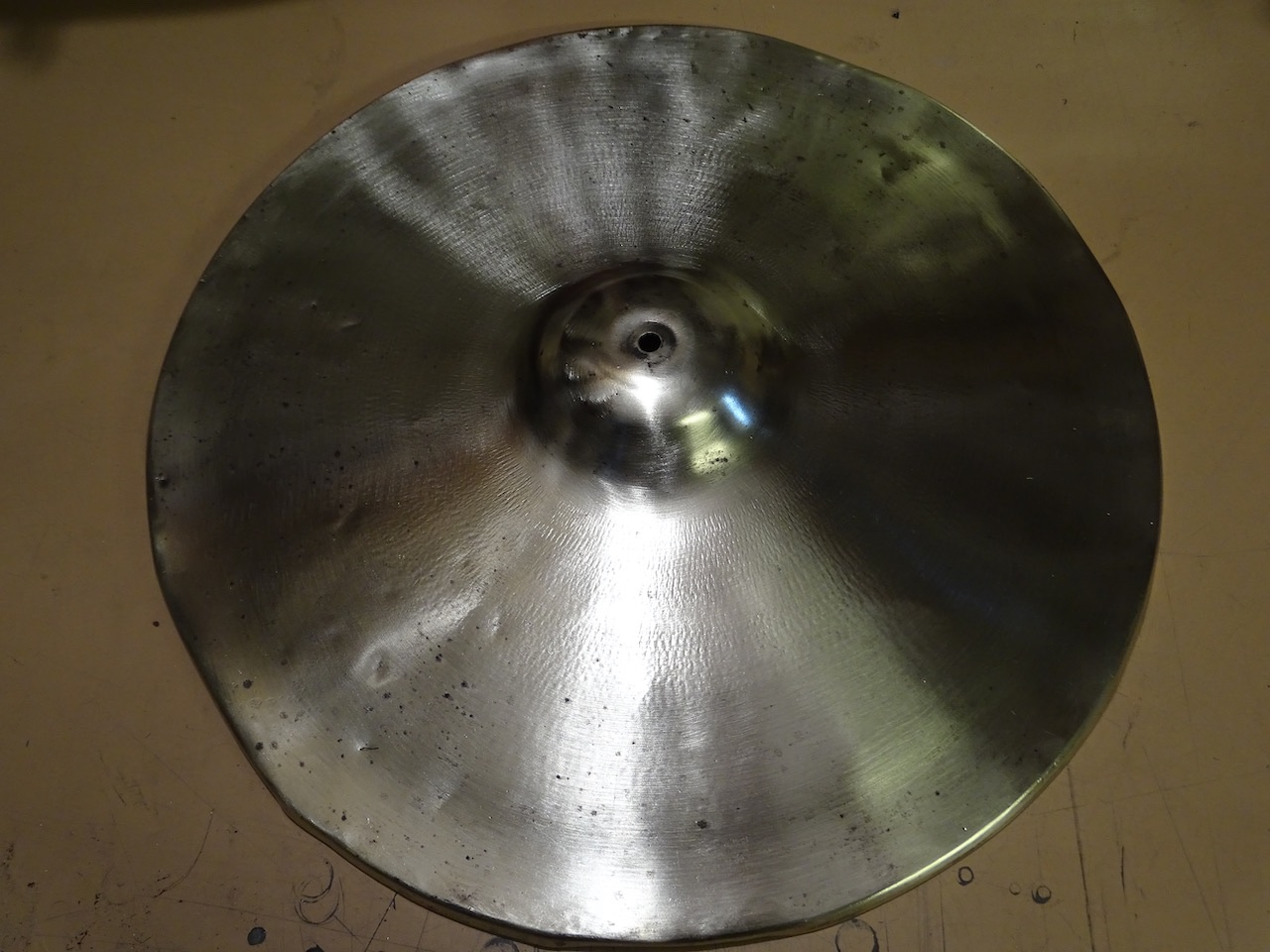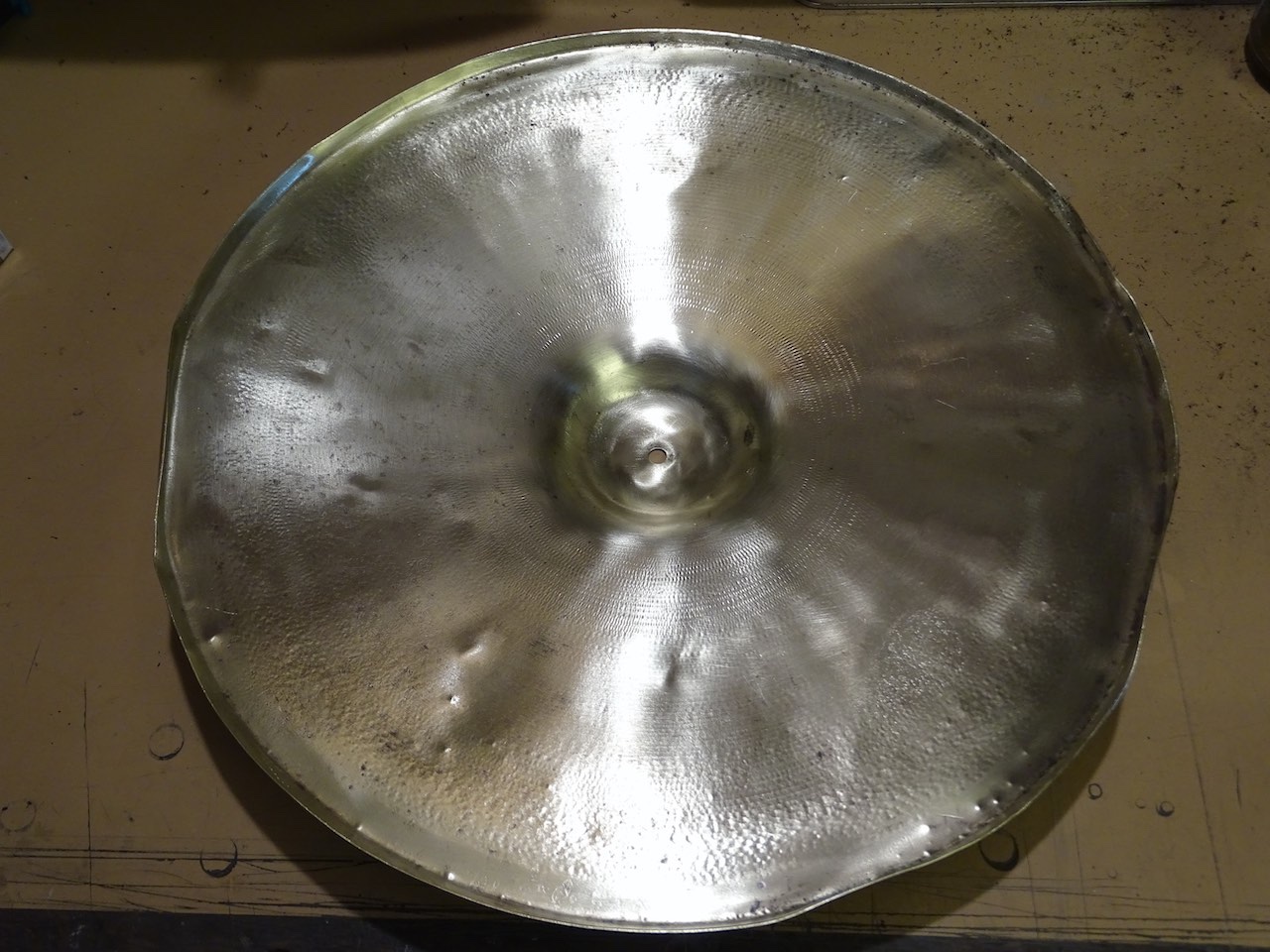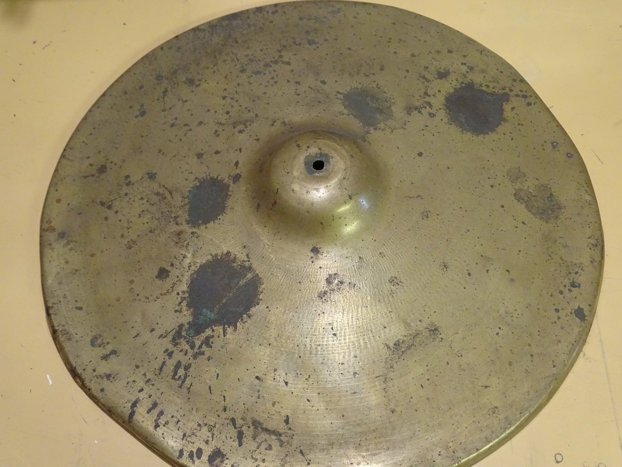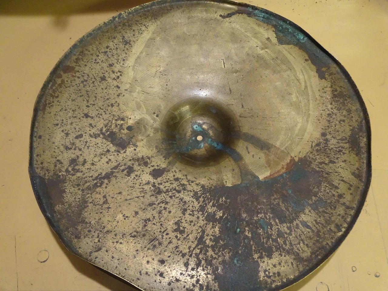 C'était une restauration de cymbale qui te rappellera des souvenirs ! Extrêment tâchée par je ne sais quel produit (une sorte de ciment) que je n'arrivais pas à ôter, du coup, aux grands maux... décapage du métal et création d'une patine... ça devrait te donner d'autres idées :wink: