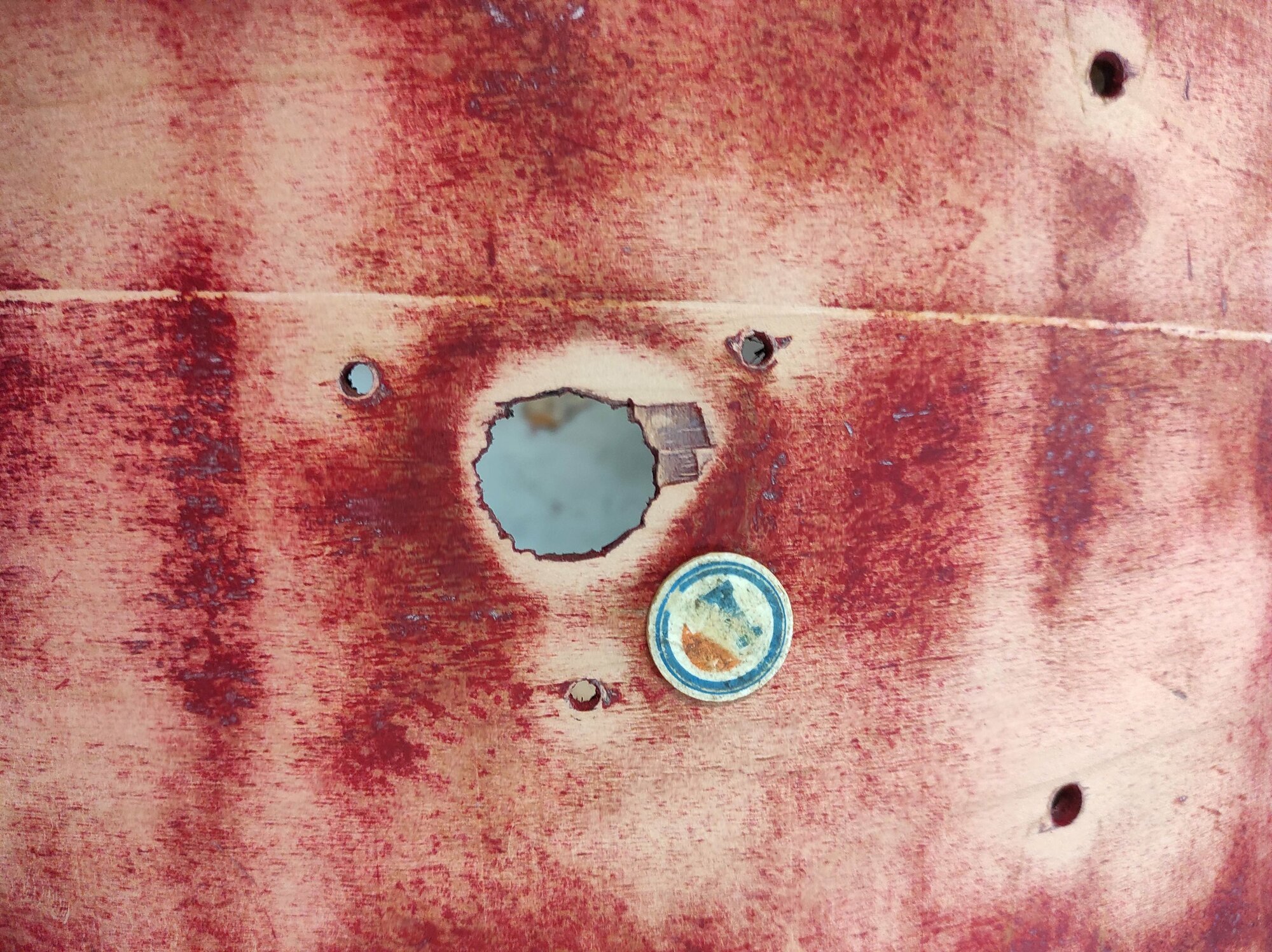Prochaine étape boucher les trous. Je pense opter pour de la pâte à bois, le plus gros es celui en photo, ce n'est pas non plus énorme, j'ai mis un jeton pour comparer.